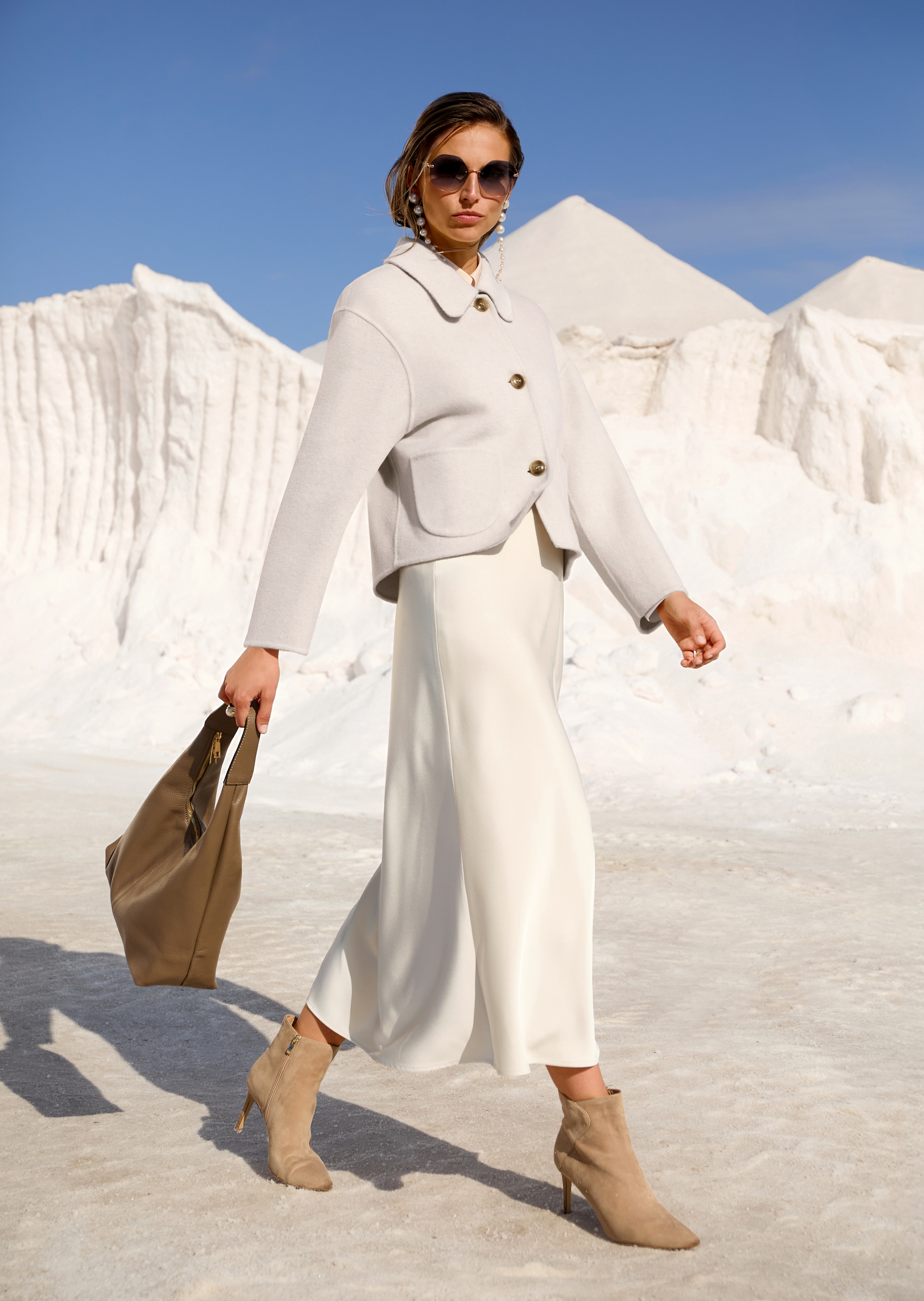Eine Jacke, die Klarheit mit modischer Raffinesse verbindet und durch ihre kastige Kurzform zum Lieblingsstück der Saison avanciert. Der formschöne Kragen verleiht dem Design eine individuelle Note, während aufgesetzte Taschen mit dekorativem Zierstich Charme und Dynamik ins Spiel bringen. Ein moderner Look, der Präsenz zeigt und gleichzeitig vielseitig kombinierbar ist – ob zu fließenden Silhouetten oder zu klaren Linien. Knöpfe in edler Horn-Optik verleihen der Kurzjacke einen Hauch klassischer Noblesse, während überschnittene Schultern und lange Ärmel den Look unaufgeregt abrunden. Die Wolle-Kaschmir-Mischung überzeugt mit flauschiger Optik und bietet luxuriösen Tragekomfort.