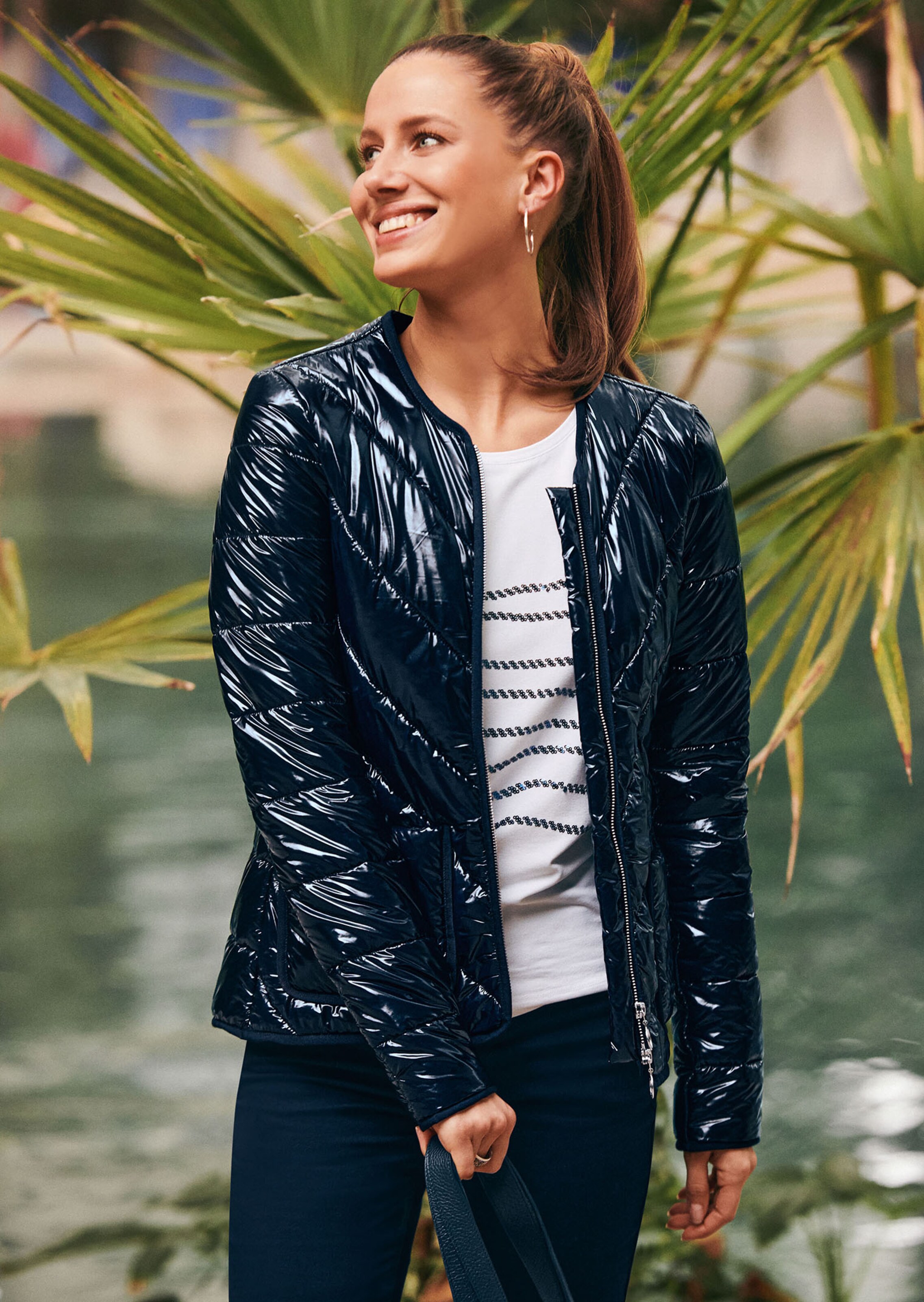 Eine Jacke, die Emotionen weckt und Lust auf Mode macht. Glänzende Oberflächen und leuchtstarke Farben sind alles andere als zurückhaltend und wollen gesehen werden! Wertvoller Sandwich-Stepp ist angenehm leicht wattiert und glänzt an der Vorderseite mit diagonalem Verlauf. Die trendstarke Kurzform rückt jeden Auftritt ins Rampenlicht und zieht modebegeisterte Blicke an. Der kragenlose Rundhals-Style ist mit langen Ärmeln und einem sportiven Front-Reißverschluss ausgestattet und sorgt durch zwei aufgesetzte Taschen für ausreichend Stauraum. Ein Kettenaufhänger schenkt stabilen Halt an der Garderobe.