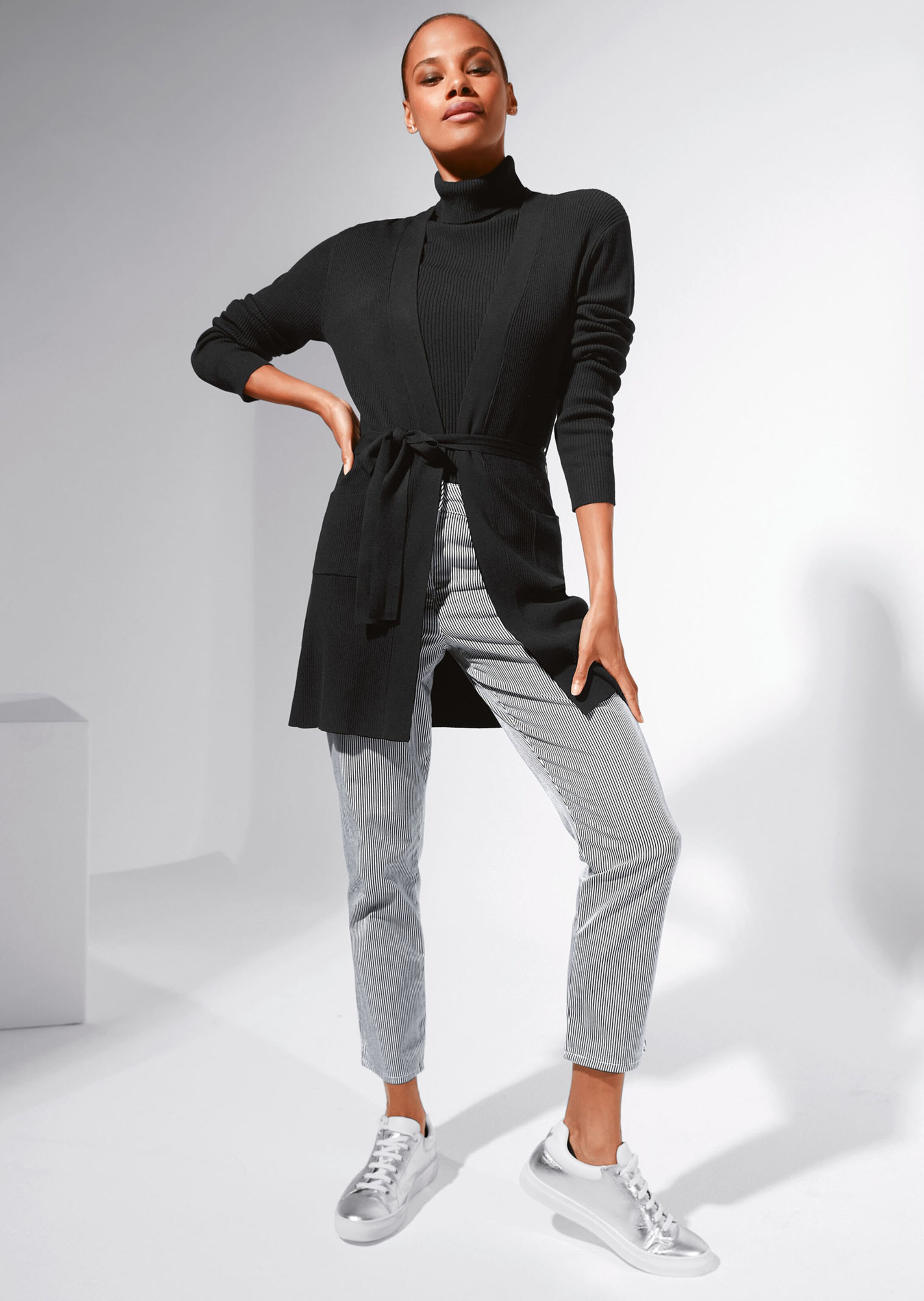Lässig-Chic in softem Strick! Hautschmeichelnde Maschenmode hat jetzt Hochsaison und verleiht angesagten Looks ein eindrucksvoll harmonisches Finish. Weicher, formstabiler Rippstrick macht diese Jacke bequem und elastisch. Wertvoll fully fashioned präsentiert sich das Lieblingsstück hier in lässig langer, figurnaher Linie und ist in der Taille per Bindeband zu schließen. Ein tiefer V-Ausschnitt, lange Ärmel und eine französischer Schulter machen den Look komplett, während aufgesetzte Taschen für bequemen Stauraum sorgen.