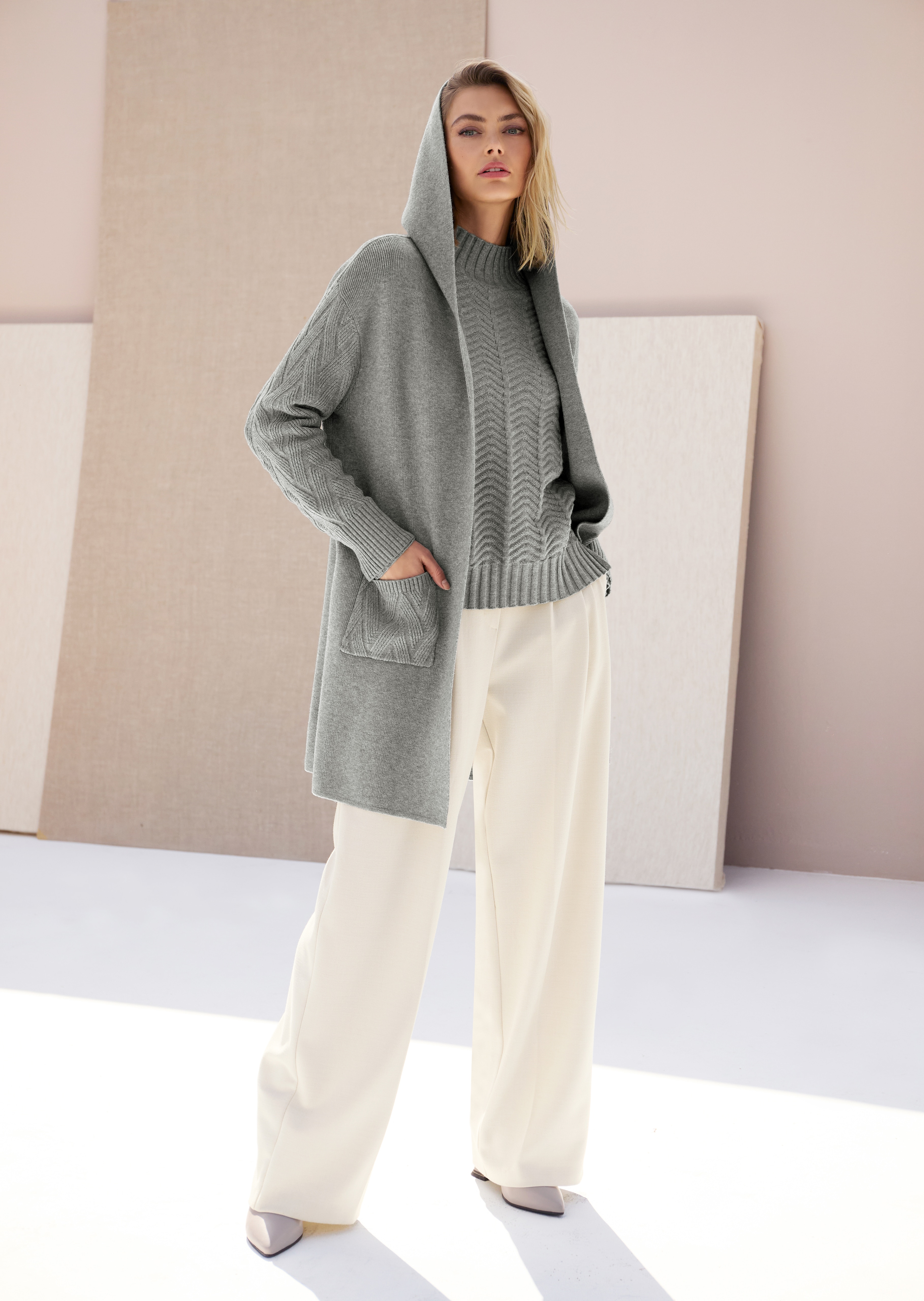 Eine selbstbewusste Mischung aus Lässigkeit und Eleganz. Die ausdrucksstarke Longform der Jacke verzichtet bewusst auf Verschlüsse und setzt auf eine zeitgemäß entspannte Silhouette. Die angearbeitete Kapuze bringt urbanen Chic ins Spiel und macht die Jacke zum perfekten Begleiter angesagter Layer-Looks. Jacquard-Details an Ärmeln und Taschen sorgen für einen spannenden Kontrast und heben sich wirkungsvoll von der glatt gestrickten Body-Partie ab. Die langen Ärmel schließen mit breiten, formstabilen Rippenbündchen ab. Ein vielseitig einsetzbares Maschen-Highlight für die moderne Garderobe: individuell, komfortabel und von souveräner Gelassenheit.
