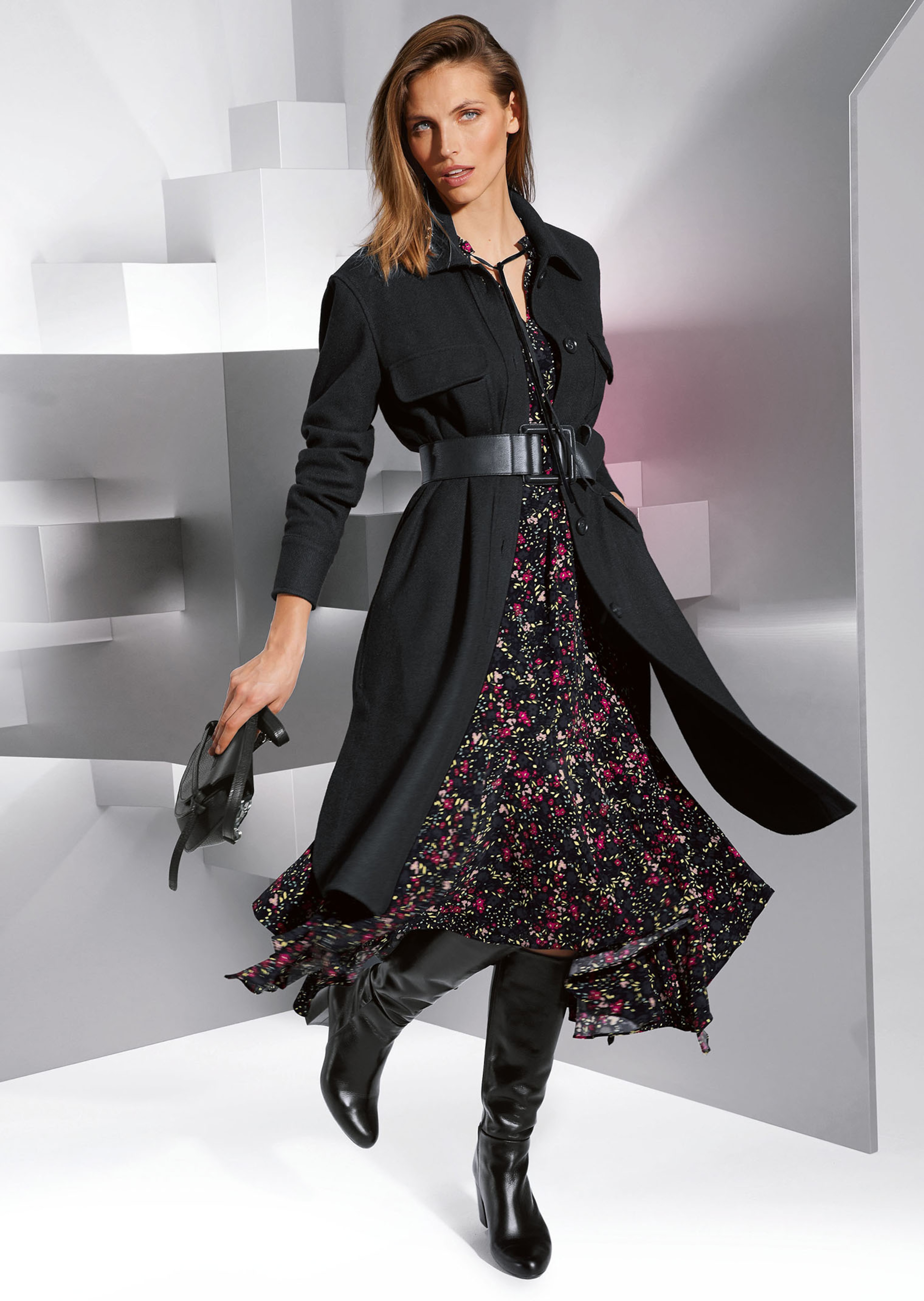 Ein echter High-Fashion-Style, der Ihren Look mit stilvoller Modernität abrundet. Wohltuend weich im Griff und ohne Futter verarbeitet ist dieser Mantel besonders leicht und sorgt für ein angenehmes Trage-Gefühl. Die gerade, komfortable Linie mischt klassisch elegante Elemente mit lässig modernen Details und sorgt so für ein eindrucksvolles Trendbild. Hemdkragen, große, aufgesetzte Brusttaschen, eine durchgehende Knopfleiste und Ärmel mit Knopfmanschetten sind State of the Art. In die Seitennaht integrierte Taschen erweitern das Platzangebot und halten außerdem die Hände warm. Hohe, abgerundete Seitenschlitze bringen Lässigkeit ins Spiel und schenken ein Plus an Bewegungsfreiheit. Ein Kettenaufhänger sorgt für zuverlässigen Halt an der Garderobe.