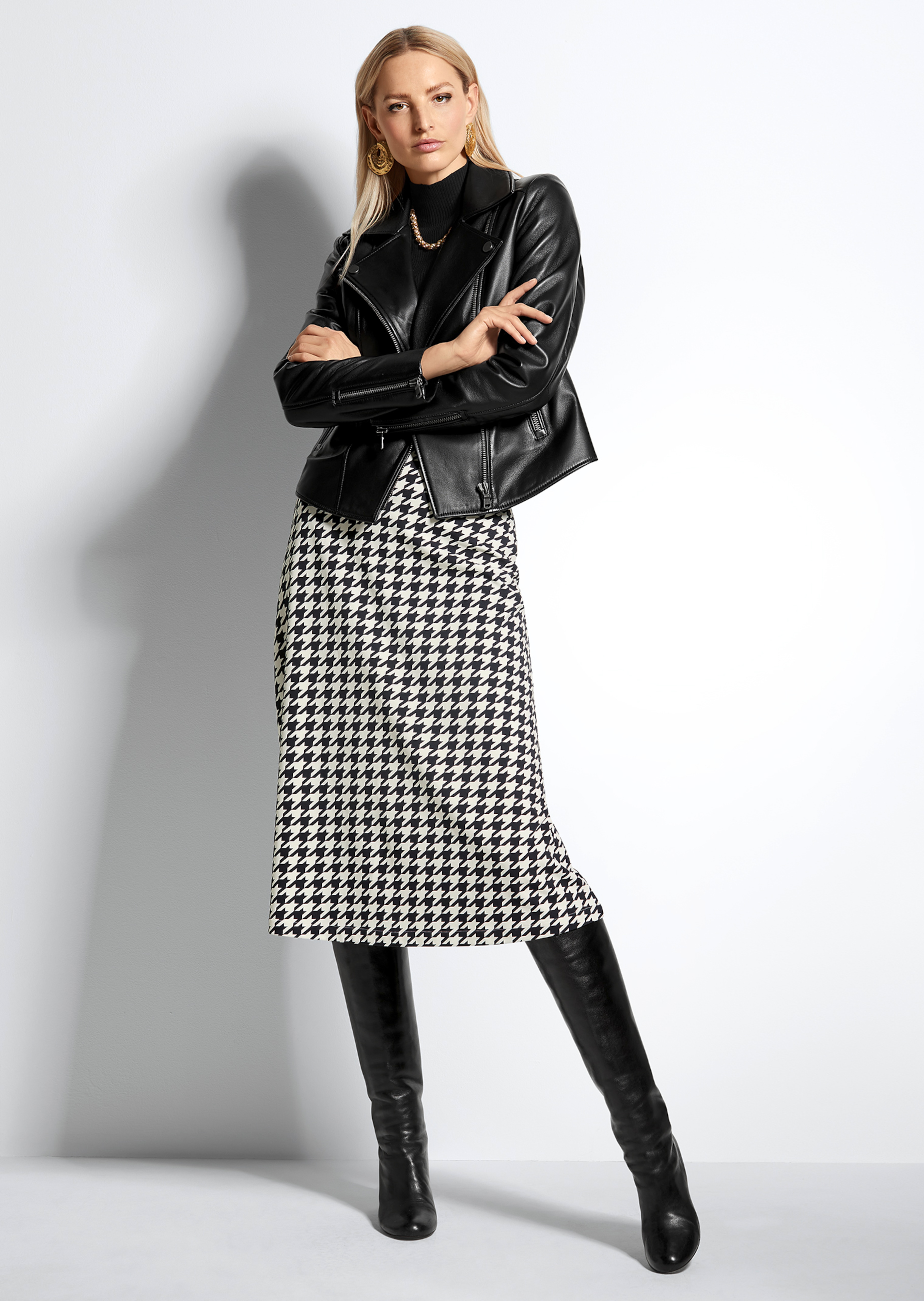 Der ideale Partner für stilvoll moderne Auftritte. Unser Rock in leicht ausgestellter Form begeistert mit einer zauberhaft femininen Silhouette und bietet gleichzeitig angenehme Bewegungsfreiheit. Der Rock ist bundlos verarbeitet und sorgt so für einen glatten, komfortablen Sitz. Ein Reißverschluss an der Rückseite ermöglicht bequemes An- und Ausziehen. Sein modisches Hahnentritt-Muster verleiht dem Rock einen zeitlos eleganten Look, der sich vielseitig kombinieren lässt.