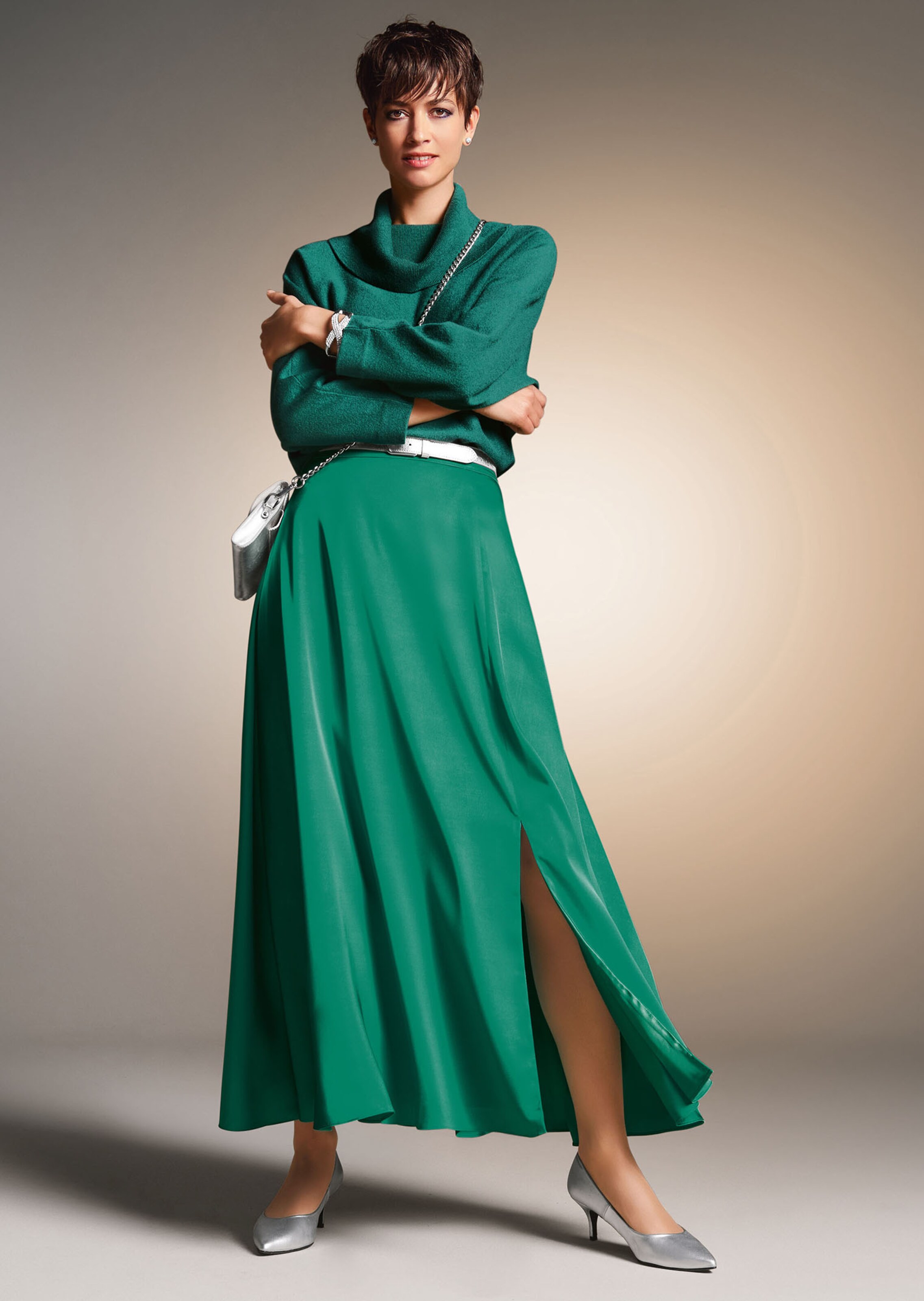 Ein Abendrock, der mit seinem wertvollen Lichtspiel begeistert! Der lange Satinrock aus geschmeidig weich fließendem, edel schimmerndem Satin schwingt wunderschön bei jedem Schritt. Modern im Style zeigt er sich mit schwingender Saumweite, Formbund, rückseitigem, verstecktem Zipper und seitlichem Schlitz. Eine Innenbundsicherung, Aufhänger und toniges Futter sind weitere Details. Er ist änderungsfreundlich, so können Sie ihn auch individuell von Ihrem Schneider anpassen lassen. Dank zusätzlicher Kurzgrößen können ihn auch kleine Frauen prima tragen.