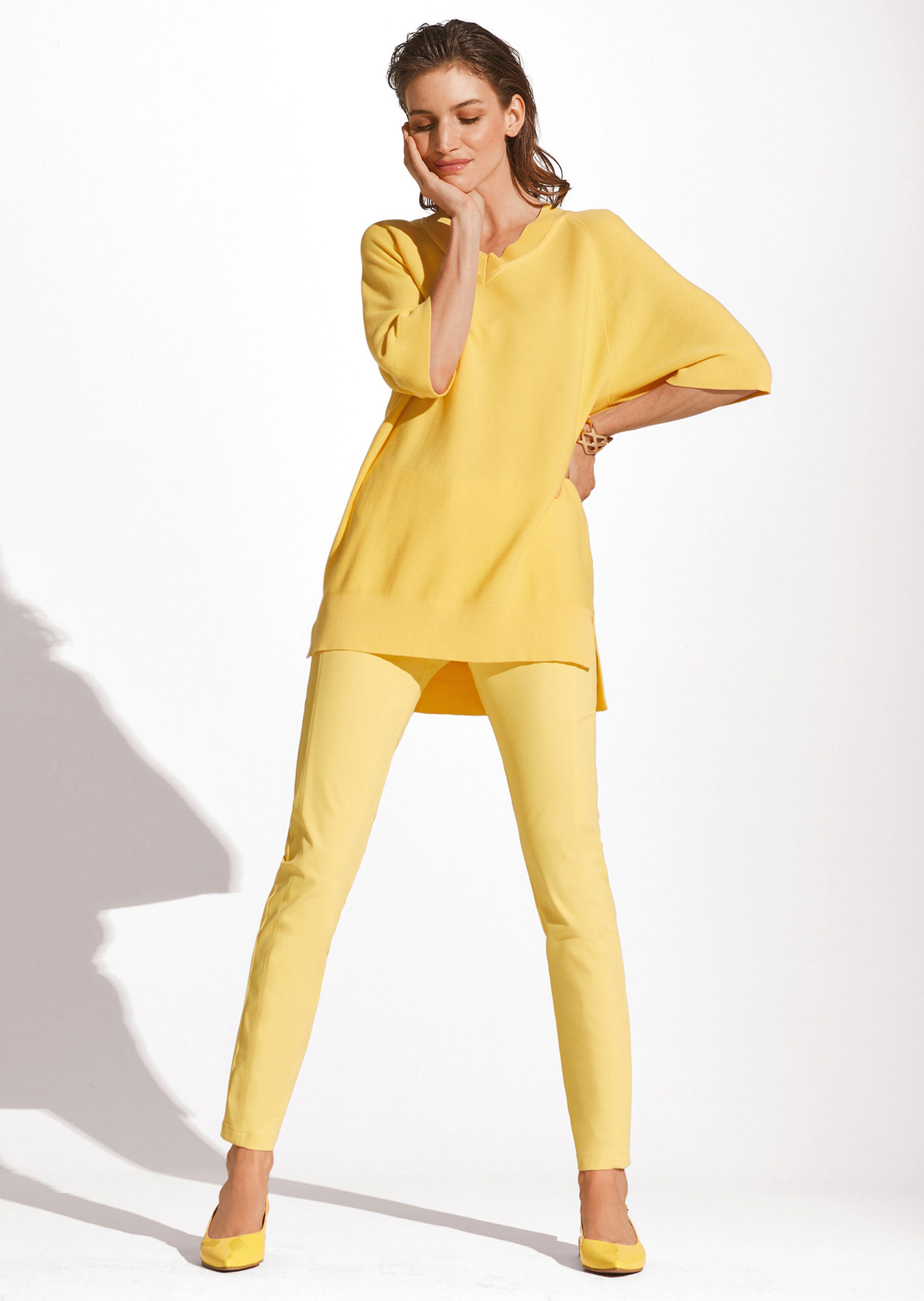 Ein Pullover, der mit seiner Lässigsilhouette den Trend setzt. Der lange Strickpullover mit V-Ausschnitt umspielt leger die Figur. Der Baumwollstrick aus hochgedrehtem High-Twist-Garn trägt sich angenehm kühl und natürlich. Der dezente Oversizedstyle ist mit verlängertem Rückteil, feminin gestaltetem Raglan-Kurzarm, V-Ausschnitt und Seitenschlitzen gestaltet. Kombinieren Sie ihn zu schlanken Partnern für eine angesagte Silhouette.