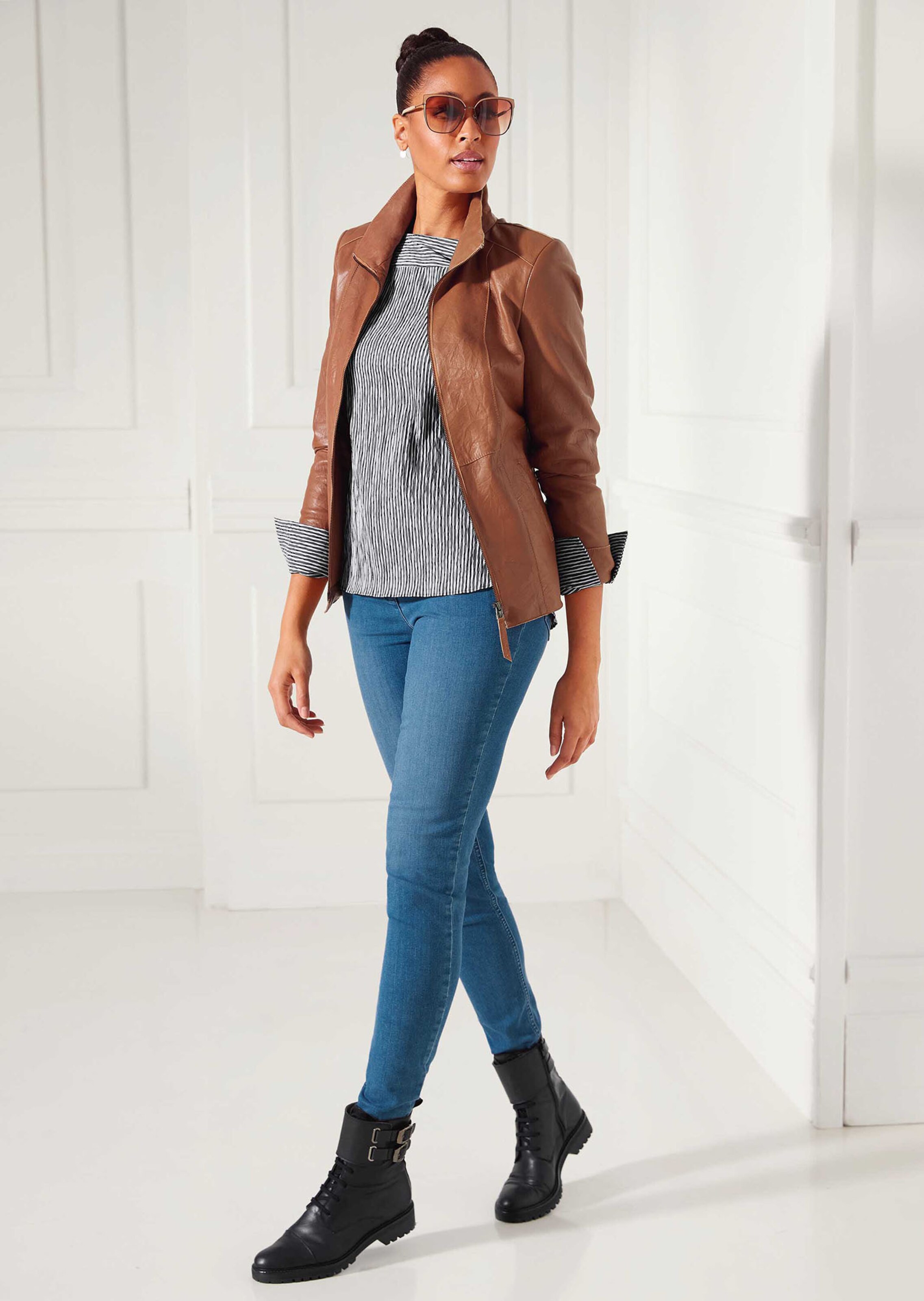 Handschuhweich im Griff, cool und souverän im Look und von erstklassiger Qualität: Edles Lammnappa macht diese Kurzjacke zu einem echten Fashion-Highlight und glänzt mit einem Plus an Modernität. Die Crash-Struktur kommt durch den leichten Glanz besonders effektvoll zur Geltung und schenkt der Luxusjacke ihren sportiven und attraktiven Charakter. Ein Modepartner mit Anspruch und Ausstrahlung, der aktuellen Denim-Styles eine exquisite Note verleiht. Schlank und leicht tailliert in der Linie präsentiert sich die Jacke mit aktuellem Stehkragen und einem stufenlos verstellbaren Zwei-Wege-Reißverschluss. Die Ärmel mit breitem Innenbeleg sind am Saum geschlitzt und können dadurch problemlos umgeschlagen werden. Eingearbeitete Leistentaschen schaffen Stauraum, während zahlreiche Teilungsnähte die Optik dekorativ aufpeppen. Das Futter ist farblich auf die Lederfarbe abgestimmt und beweist viel Liebe zum Detail.
