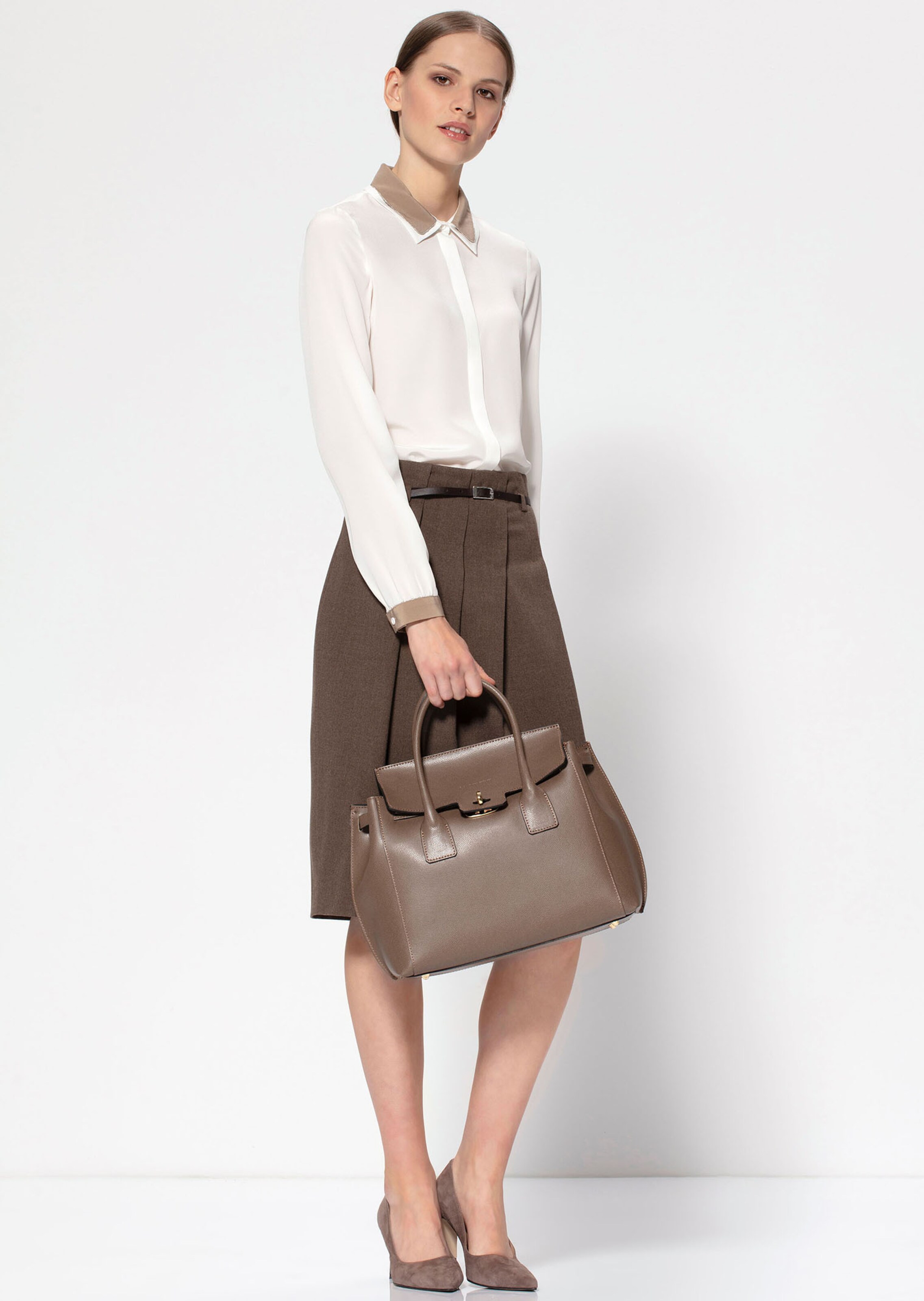 Eine stilvolle Handtasche, die mit zeitloser Eleganz begeistert. Handgefertigt in Italien wird sie höchsten Ansprüchen gerecht und lässt in Sachen Material und Verarbeitung keine Wünsche offen. Das hochwertige Leder ist mit authentischer Logo-Prägung gearbeitet. Es begeistert mit weichem Glanz und lässt keine Zweifel an seiner modischen Herkunft. Der geräumige Innenraum mit Reißverschluss-Fach und Steckfach schenkt Ihren Utensilien ausreichend Platz und wird von einem Überschlag mit Drehverschluss gesichert. Die 2 Trage-Griffe und ein abnehmbarer, verstellbarer Umhängeriemen lassen Ihnen die Wahl, ob Sie die Tasche in der Hand, oder – wenn Sie die Hände frei haben möchten – lässig über der Schulter tragen möchten.
