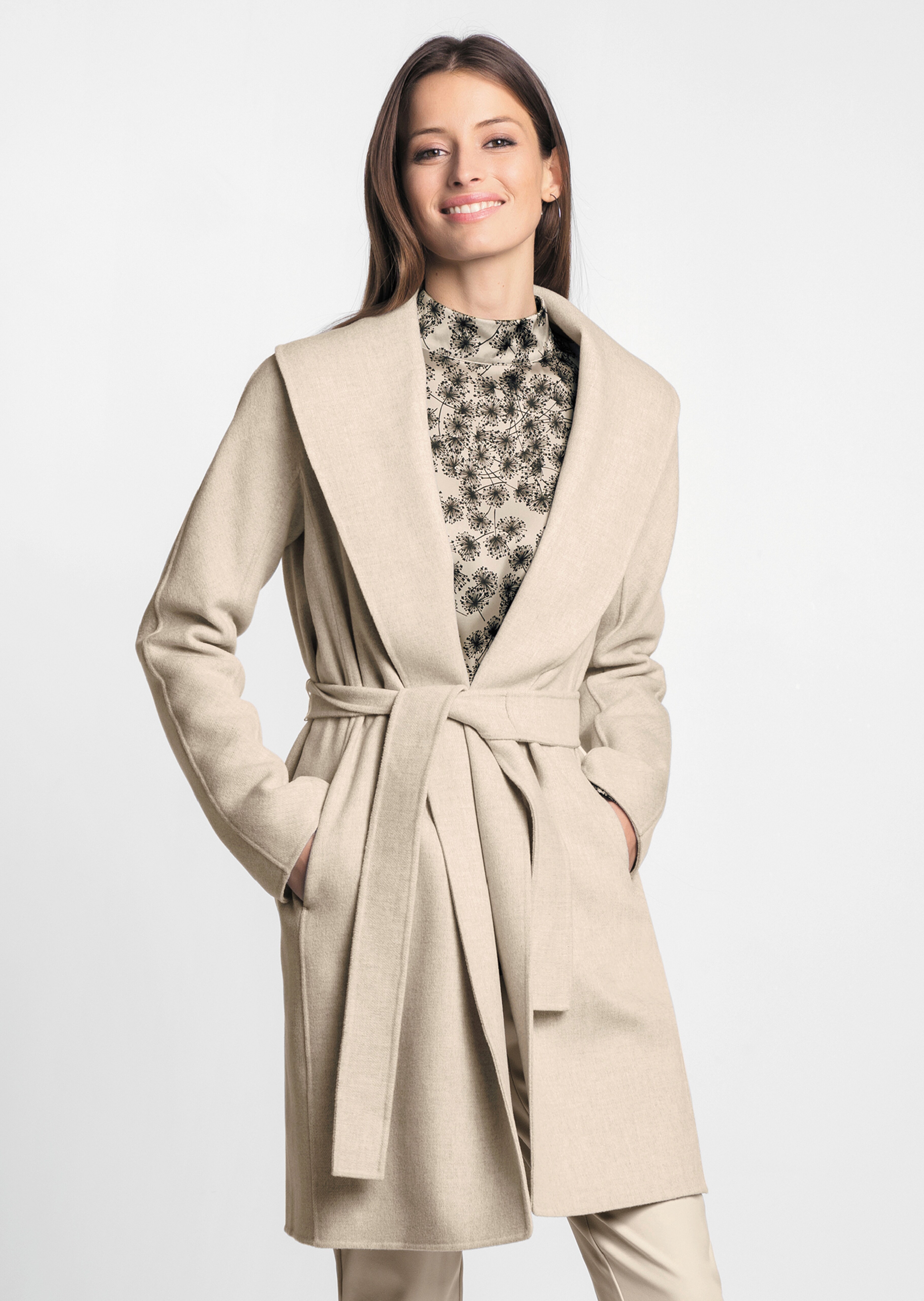 Edel im Ton und wertvoll in der Qualität: Der leichte Wollmantel in futterloser Doubleface-Qualität zeigt sich mit stilvoller Innen- und Außenseite. Die schlanke, gerade Form ist mit Schalkragen, unauffälligen Nahttaschen, MADELEINE Kettenaufhänger und Bindegürtel gestaltet. Durch die reine Wolle trägt er sich angenehm wärmend. Kombinieren Sie ihn zu tonigen Partnern oder zu den stilvollen Druckmodellen der Saison für einen modernen Trendlook. Ob im Büro oder in der City: Der leichte Übergangsmantel hat Stil.