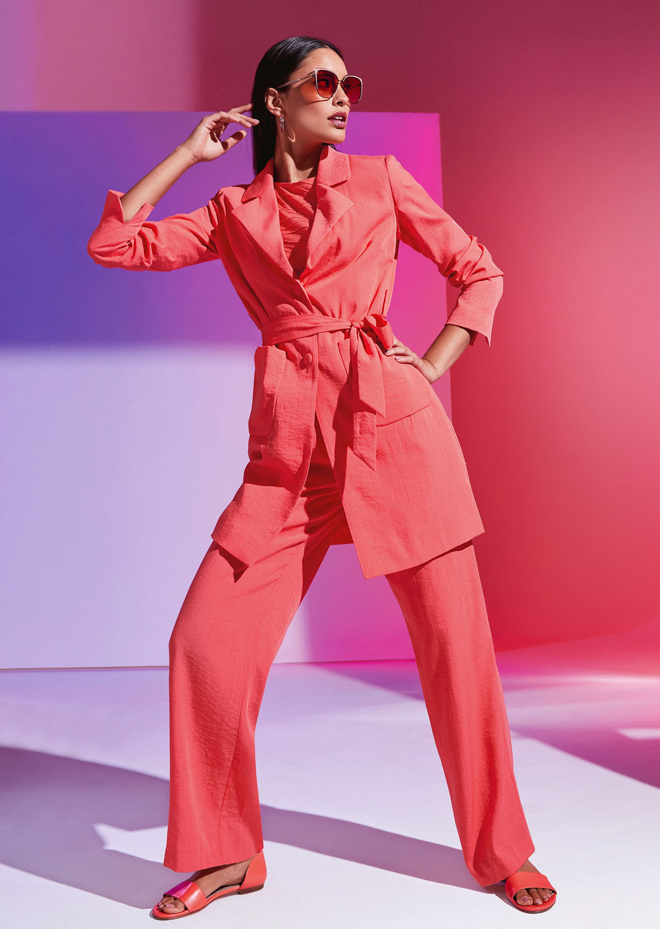 Eine Jacken-Variante in angesagter Trendfarbe! Die lässig-moderne Ausstrahlung der langen Blazerform wird durch den Taillengürtel besonders hervorgehoben. Er wird rundum von Gürtelschlaufen fixiert und lässig gebunden. Ein kurzer Reverskragen, lange Ärmel mit Saumschlitz und aufgesetzte Taschen machen den Look komplett. Schulterpolster verleihen auf dezente Weise Kontur.