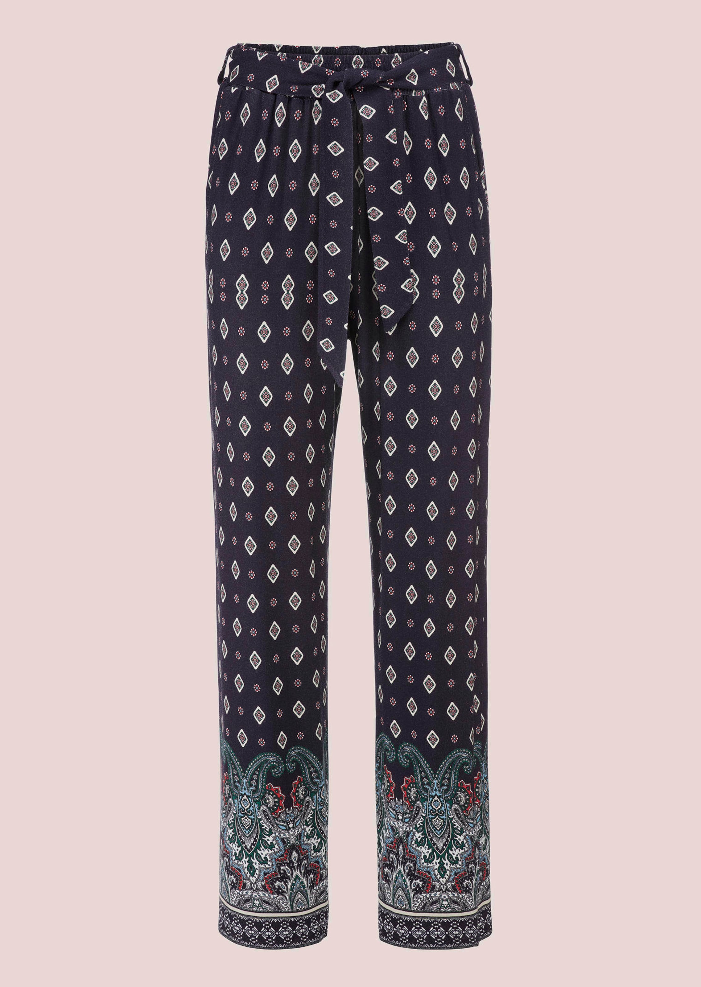 Loungewear-Hose von PLANTIER – ein lässiger Begleiter mit charmantem Bordürendruck. Die softe Viskose-Qualität mit Elasthan schenkt angenehmen Komfort und bleibt trotzdem formstabil. Ein breiter Rundumschlupfbund mit Stoffgürtel sorgt für variablen Sitz, mit zwei seitlichen Eingriffstaschen. Der modisch entspannte Schnitt macht die Hose vielseitig kombinierbar.