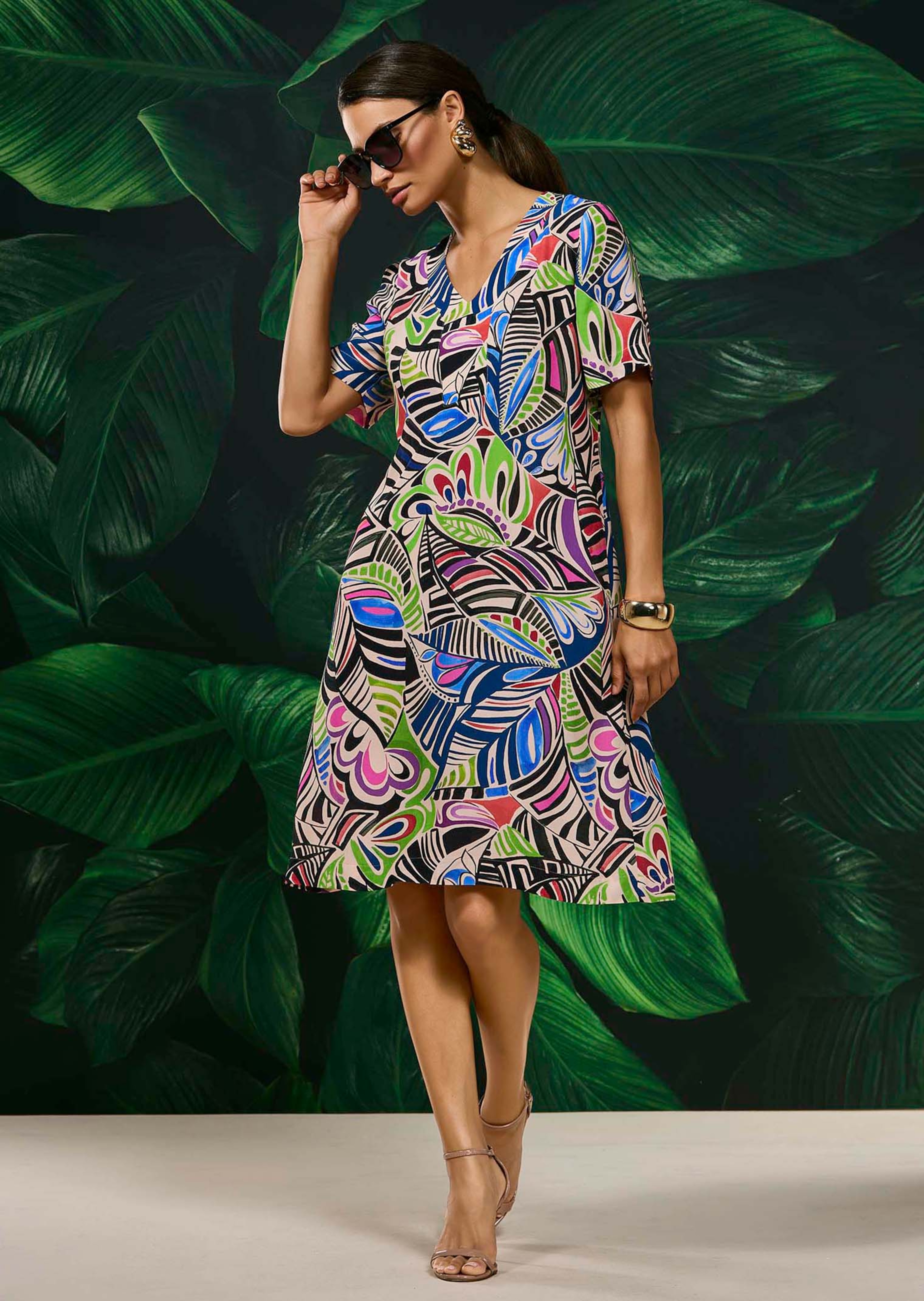 Dieses farbenprächtige Kleid aus fließender Viskose-Crêpe-Qualität ist ein Lieblingsteil für den Sommer. Mit seiner luftigen und lockeren Form im Kaftan-Stil umspielt es die Figur und bietet ein angenehmes Tragegefühl. Der modische grafische Print macht jedes Kleid zu einem Unikat und zieht alle Blicke auf sich. Der V-Ausschnitt mit Blende und die halblangen, etwas weiteren Ärmel sorgen für zusätzlichen Komfort an heißen Tagen. Ideal für Strand, Stadt oder sommerliche Aktivitäten – dieses Kleid vereint eine luftige, weite Form mit farbenfrohem Stil. Pflegeleicht und waschbar, begleitet es Sie mühelos durch die warmen Tage.