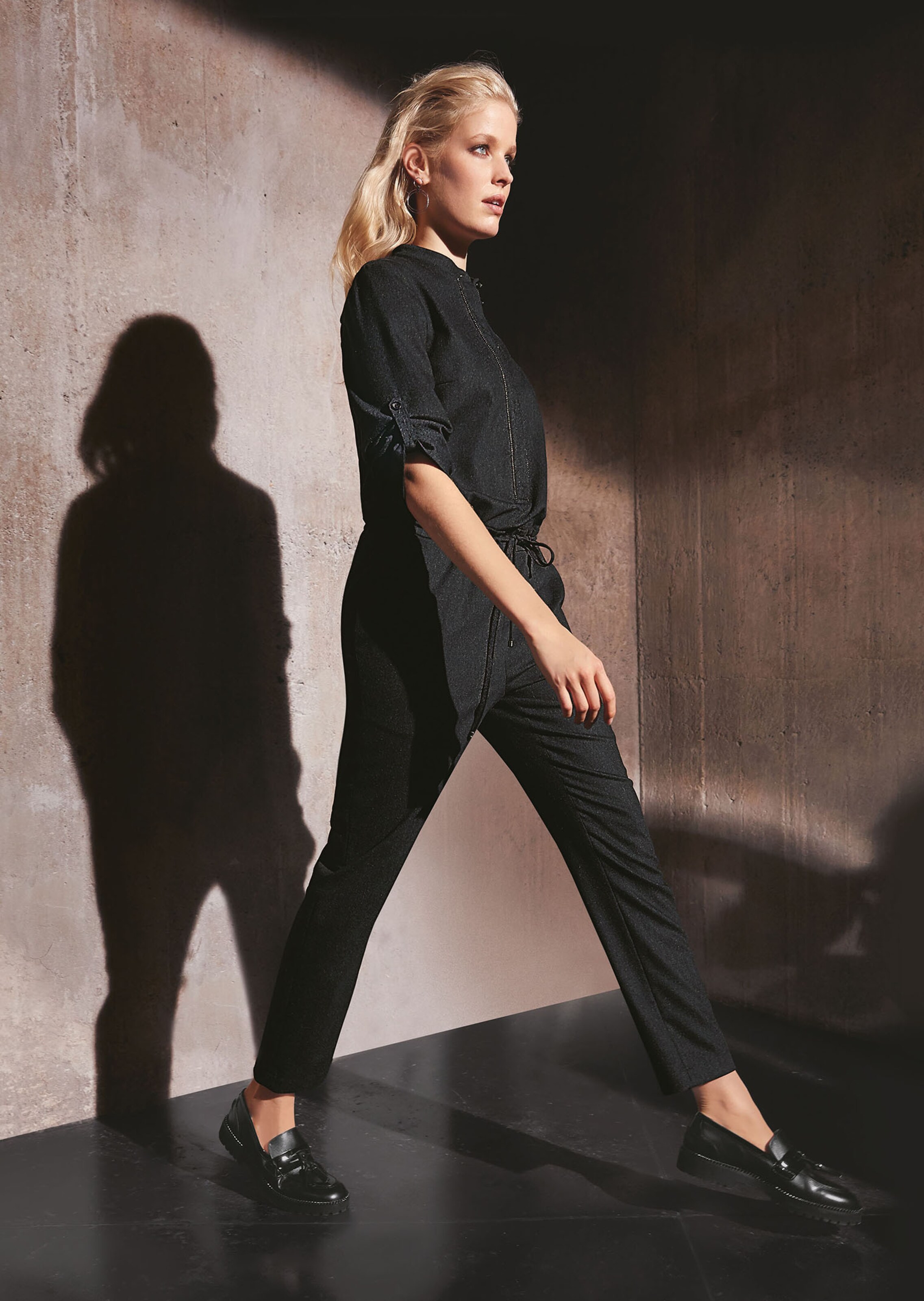Dieser Einteiler beeindruckt mit lässig eleganter Modernität. Er präsentiert ein komplettes First-Class-Outfit in nur einem Stück. Der Anteil an Wolle ist angenehm weich im Griff und dank Melange-Effekt edel im Look. Der Stretch-Anteil sorgt für erstklassigen Trage-Komfort und macht jede Bewegung mit. Overalls sind ein wichtiges Mode-Thema und bringen Glanz in die neuen Sortimente. Die lange und verdeckt gearbeitete Knopfleiste des Modepartners wird von feinen Zierkettchen in Szene gesetzt. Sie verleihen ihm eine Prise Glamour und machen ihn absolut eventtauglich. Die langen Ärmel können auf Wunsch auch lässig gekrempelt und per innenseitigem Knopfriegel fixiert werden. Ein kleiner Stehkragen sowie die Rückenpasse mit Kellerfalte machen das Oberteil komplett. Die Taillenpartie wird von einem elastischen Bund mit eingearbeitetem Zugband akzentuiert und lockert den Look sehenswert auf. Die schlanke Hose ist mit seitlichen Schubtaschen und edel paspelierten Gesäßtaschen ausgestattet.