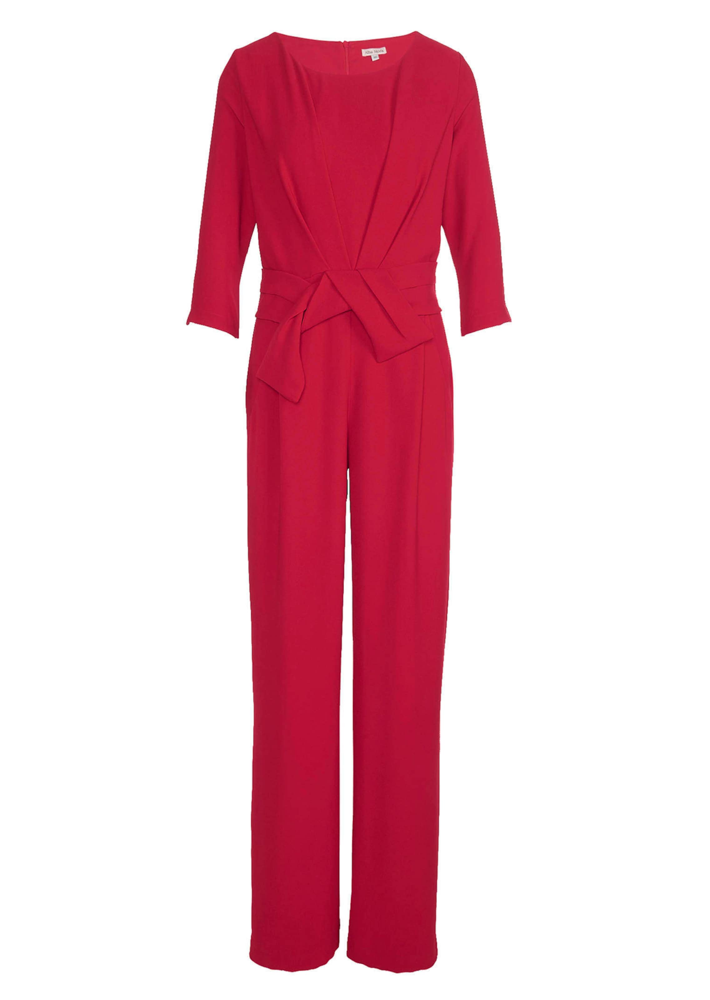 Overall mit Oberteil im Layering-Look und Hosenteil im Marlenestil. Ziergürtel auf Taillenhöhe. 3/4-Ärmel mit Schlitz. Seitliche Eingrifftaschen. Reißverschluss auf der Rückseite. Innenbeinlänge in Gr. 38 ca. 86 cm.