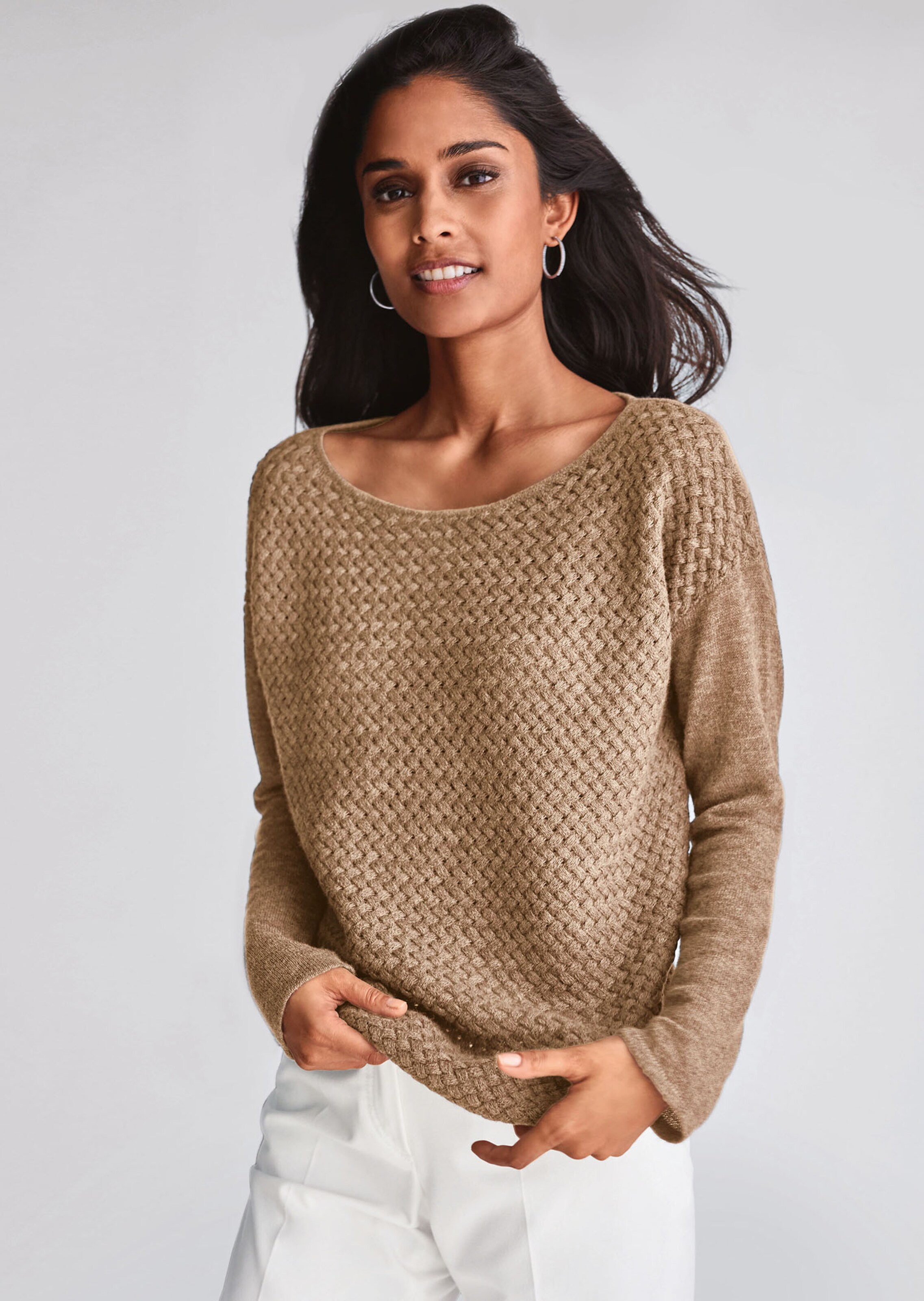 Auch in der Strickmode werden lebendige Optiken favorisiert! Dieser edle Pullover rückt den Trend in ein besonders schönes Licht. Die hochwertige Merino-Kaschmir-Mischung schenkt nicht nur das kuschelig weiche Tragegefühl, sie bringt auch das dekorative Flechtmuster im Vorderteil äußerst kostbar und prägnant zum Ausdruck. Ärmel und die Rückenpartie in Glattstrick setzen einen gelungenen Kontrapunkt. Aufwendig in Form gestrickt zeigt sich der Pullover in lässiger Oversize-Form und ist mit Rundhals-Ausschnitt, langem Ärmel und flachen Tubularblenden an Ärmel und Saum gestaltet. Ein Lieblingspulli par excellence – Ihrer Kombinationsfreude sind keine Grenzen gesetzt!