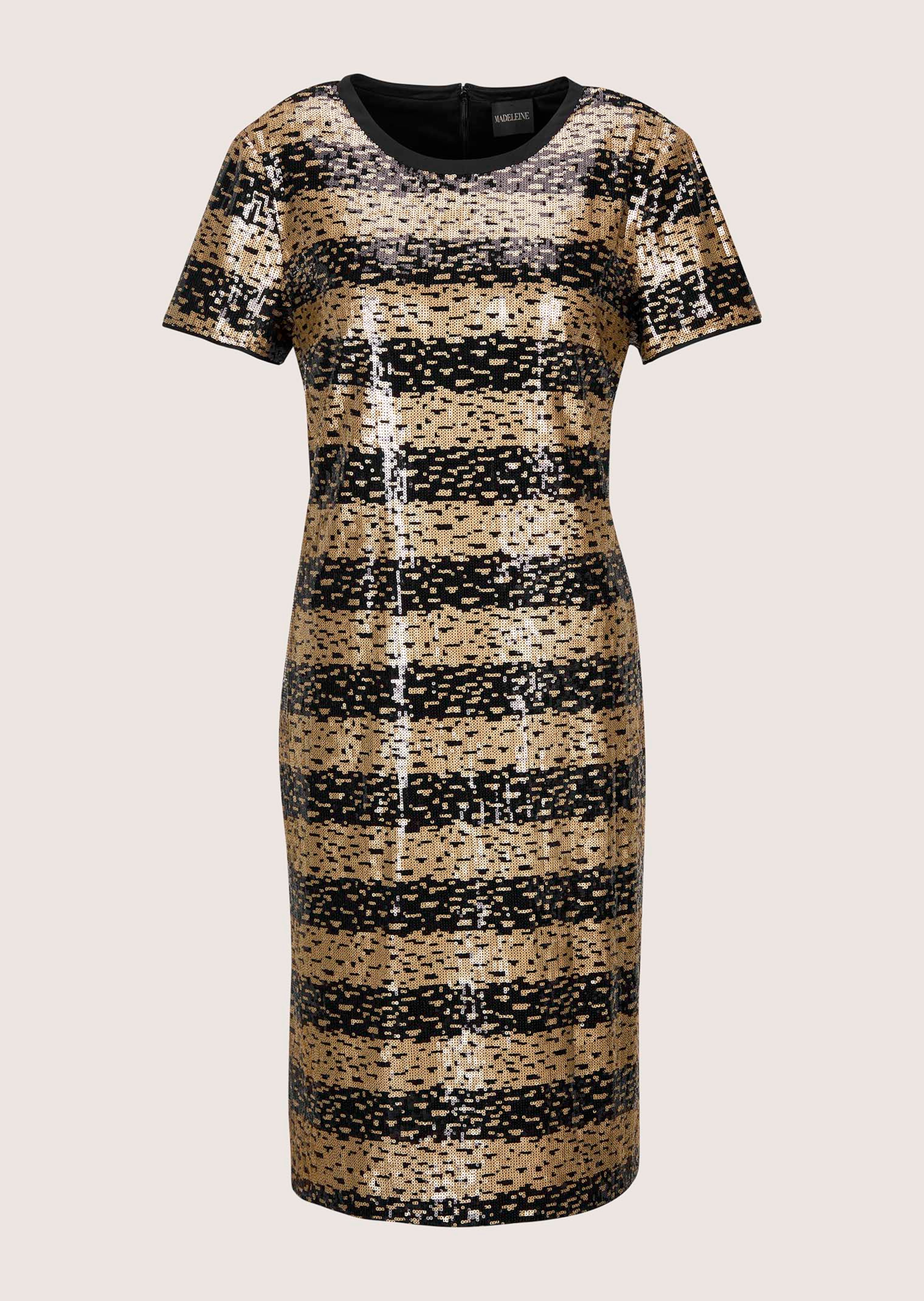 Streifenmuster sind der Liebling für Casual-Looks, werden hier aber durch schimmernde Pailletten auf Event-Level gehoben. Die leichte Taillierung, ein Rundhalsausschnitt mit Blende und kurze Ärmel fügen sich zu einem modisch-glamourösen Design. Dank Futter trägt sich das Kleid angenehm, der Reißverschluss im Rückenteil erleichtert das Anziehen. Mit High Heels und Statement-Ohrringen die perfekte Wahl für Event, Dinner oder Tanzfläche.