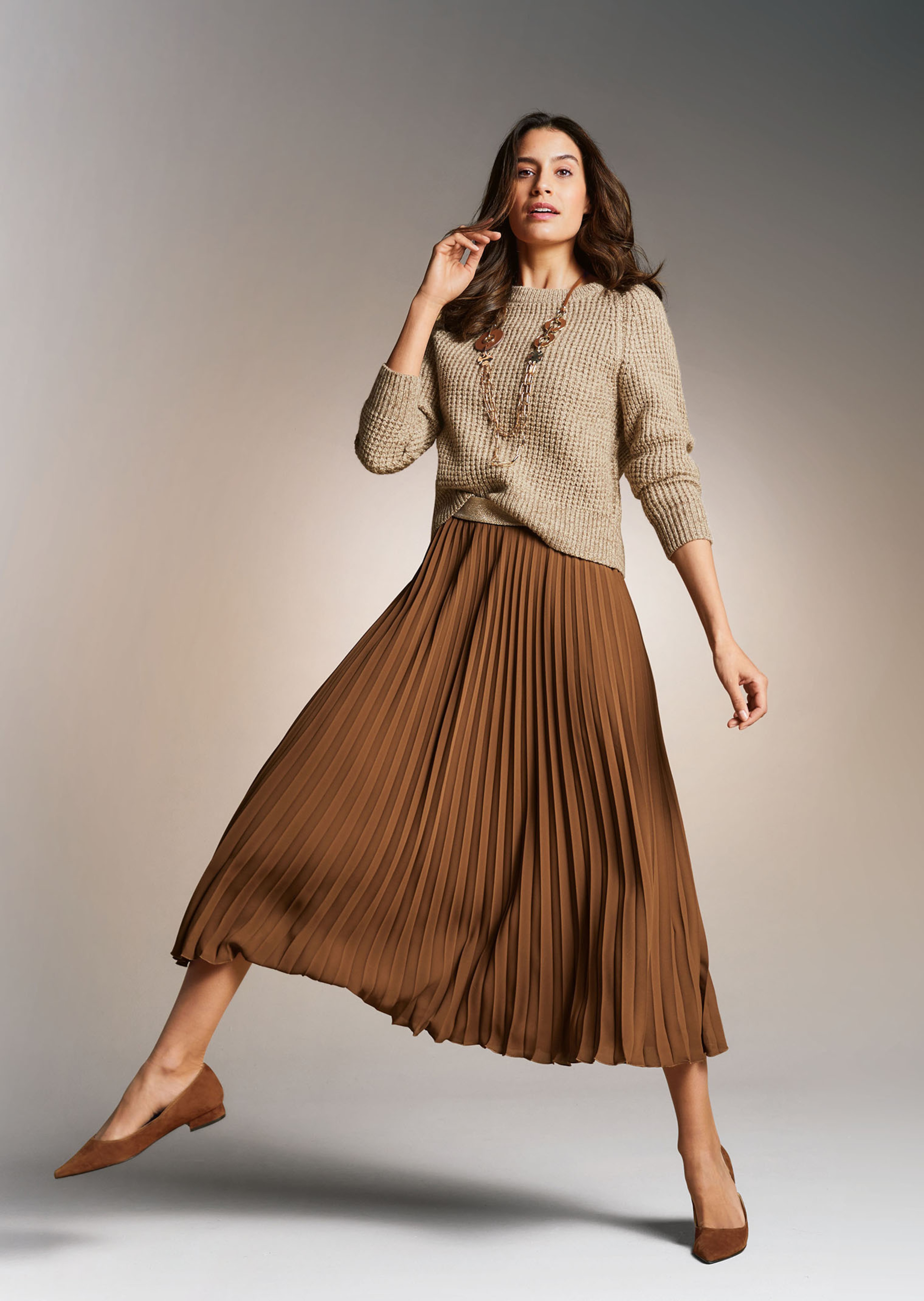 Bringen Sie Schwung in die elegante Garderobe! Der Plisseerock aus effektvollem Sonnenplissee schwingt wunderschön bei jedem Schritt. Der feine Glanzeffekt am Elastikbund macht ihn noch edler. Durch den Elastikbund trägt er sich herrlich bequem. Kombinieren Sie ihn zu leichten, fließenden Modellen oder ganz trendy zu lässigem Strick – für einen angesagten Materialmix. Dank zusätzlicher Kurzgrößen können ihn auch kleine Frauen prima tragen.
