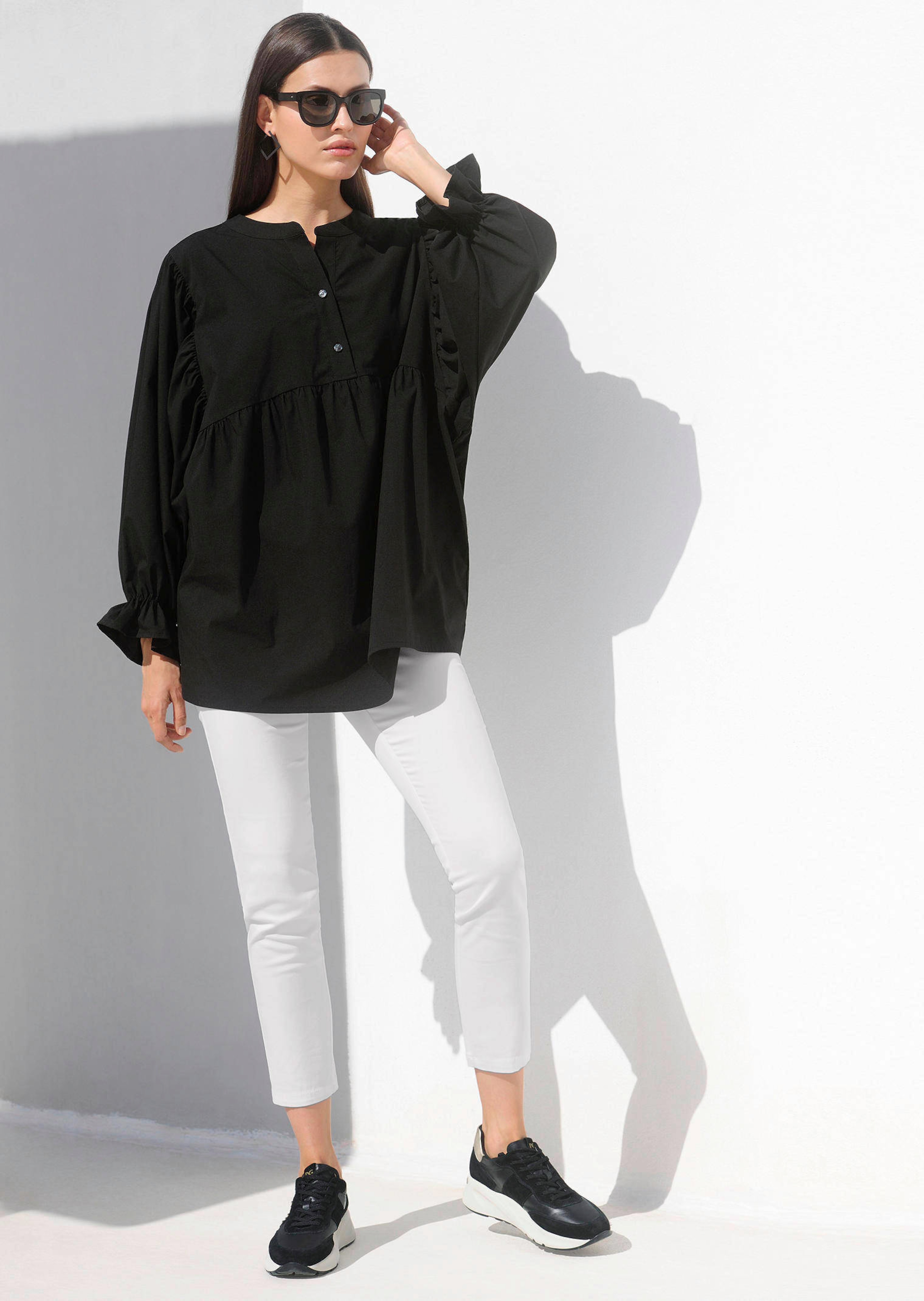 Entdecken Sie Ihren ganz individuellen Favoriten – wie zum Beispiel diese Oversized-Schlupfbluse. Besonders schöne Details sind die langen Fledermausärmel mit Gummizug und Volants. Sie hat einen Rundhalsausschnitt mit V-Ausschnitt und Knopfleiste. Angenehme Baumwoll-Popeline.