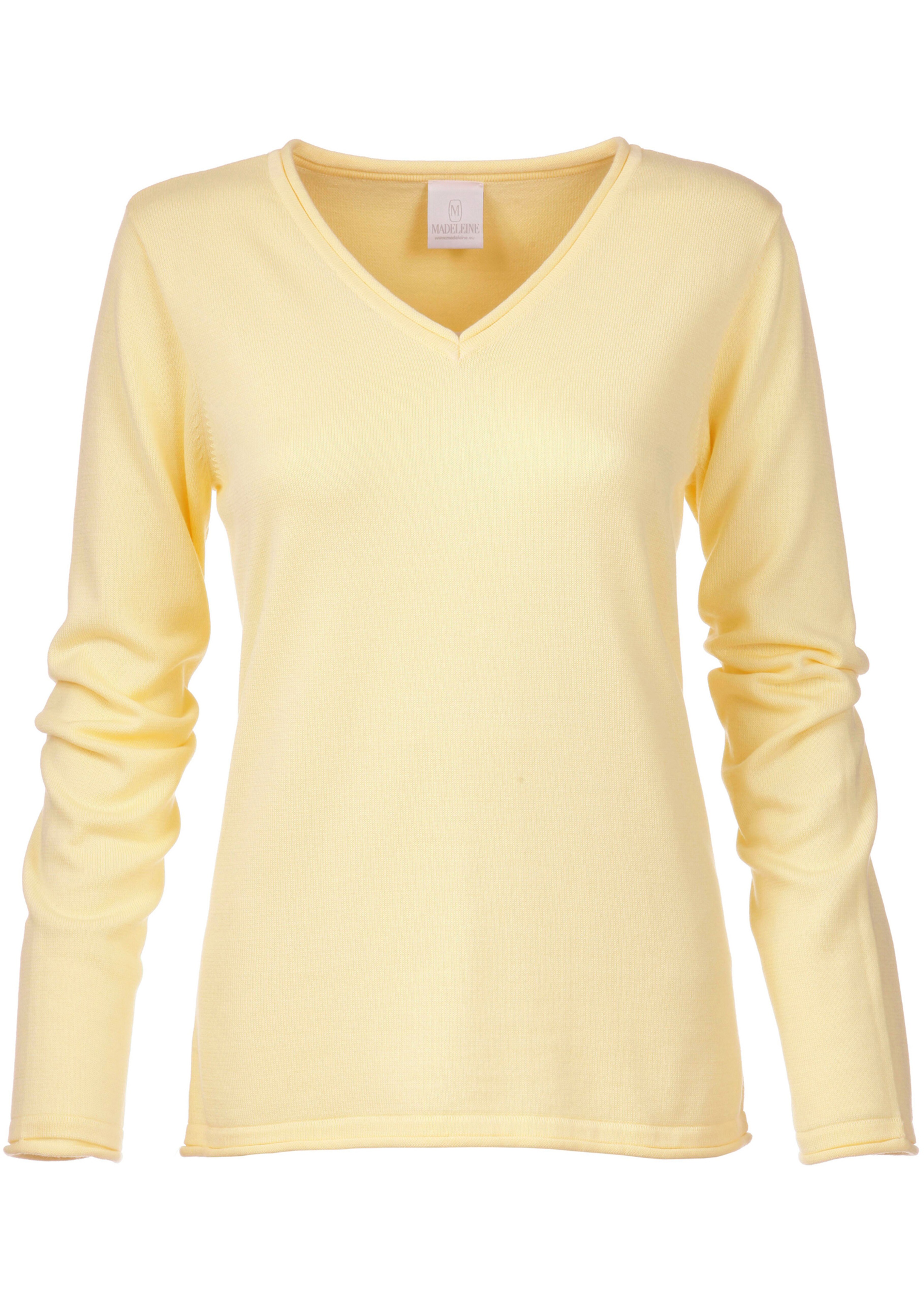 Ein Klassiker der sommerleichten Garderobe: der Strickpullover aus Pima Baumwolle mit V-Ausschnitt und langen Ärmeln, ein komfortabler Sommerpullover mit angenehmen Trage- und Pflegeeigenschaften. Der wertvolle Sommerstrick aus PIMA COTTON, der extrafeinen, langstapeligen Baumwolle zeigt sich formstabil und komfortabel als perfekte Sommerqualität für feminine Basics. Die hochwertige, kühle Baumwolle begeistert mit ihrer unbeschwerten Trageeigenschaft. In leicht taillierter Schnittführung mit V-Ausschnitt, Langarm und lässiger Rollblendenverarbeitung an den Kanten zeigt der Strickpullover seinen femininen Charme und sein gewisses Etwas. Der schlichte Style lässt ihn zu einem vielseitigen Allrounder der unterschiedlichsten Stylings werden.