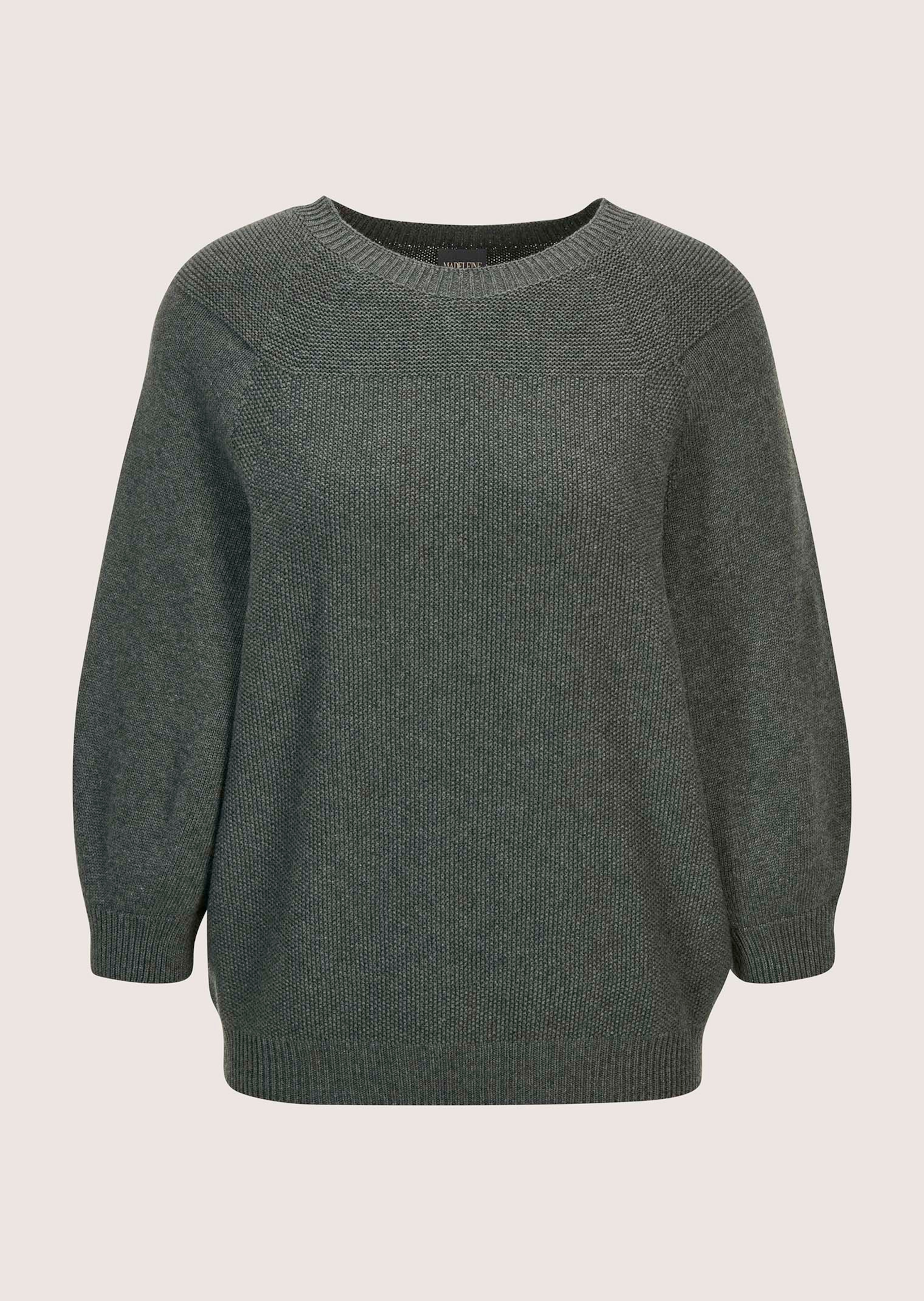Ein modisch verspielter Look, der mit zarten Kontrasten und viel Komfort begeistert. Die weiche Baumwoll-Qualität liegt dank nahtloser Verarbeitung besonders angenehm auf der Haut und schenkt ein unvergleichlich weiches Trageerlebnis – ideal für den anspruchsvollen Mode-Alltag. Die Body-Partie in feinem Perlfang-Muster bringt dezente Struktur und eine edle Note ins Spiel. Die weit geschnittenen Ärmel hingegen, die sich in attraktiver 3/4-Länge präsentieren, sind glatt gestrickt. Sie schließen mit flexiblen Saumbündchen ab und sorgen so für einen sanften Ballon-Effekt – ein feminines Detail mit modischer Wirkung. Formstabile Rippenabschlüsse sind auch an Ausschnitt und Saum zu finden und sorgen für einen zuverlässigen Sitz.