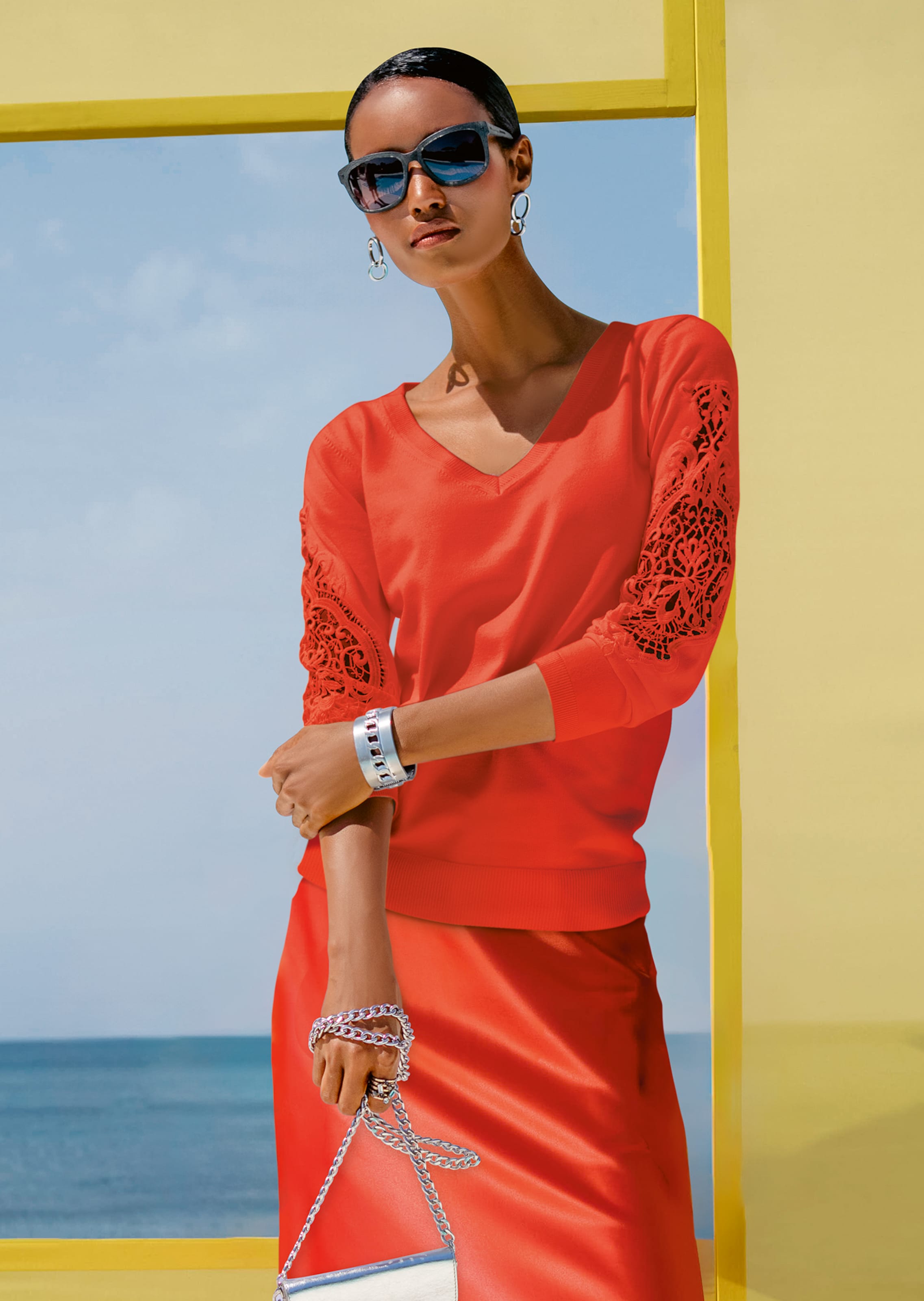 Dieser trendige Pullover beweist, dass Komfort und Romantik auch ideal harmonieren kƶnnen. Wunderschƶne, transparente Spitze am Ćrmel setzt den schmückenden Akzent und verleiht dem Pullover das besondere Extra. Der edel schimmernde Feinstrick unterstreicht seine reprƤsentative Ausstrahlung und gibt sich zudem leicht und angenehm im Tragegefühl. Feminin im Look zeigt sich der Strickpullover in figurnaher Form und ist mit V-Ausschnitt, langen Ćrmeln und Rippstrickbündchen an den Abschlüssen gestaltet. Ein Trendpiece mit Stil und luxuriƶsem Appeal ā für jeden Look und jede Gelegenheit.