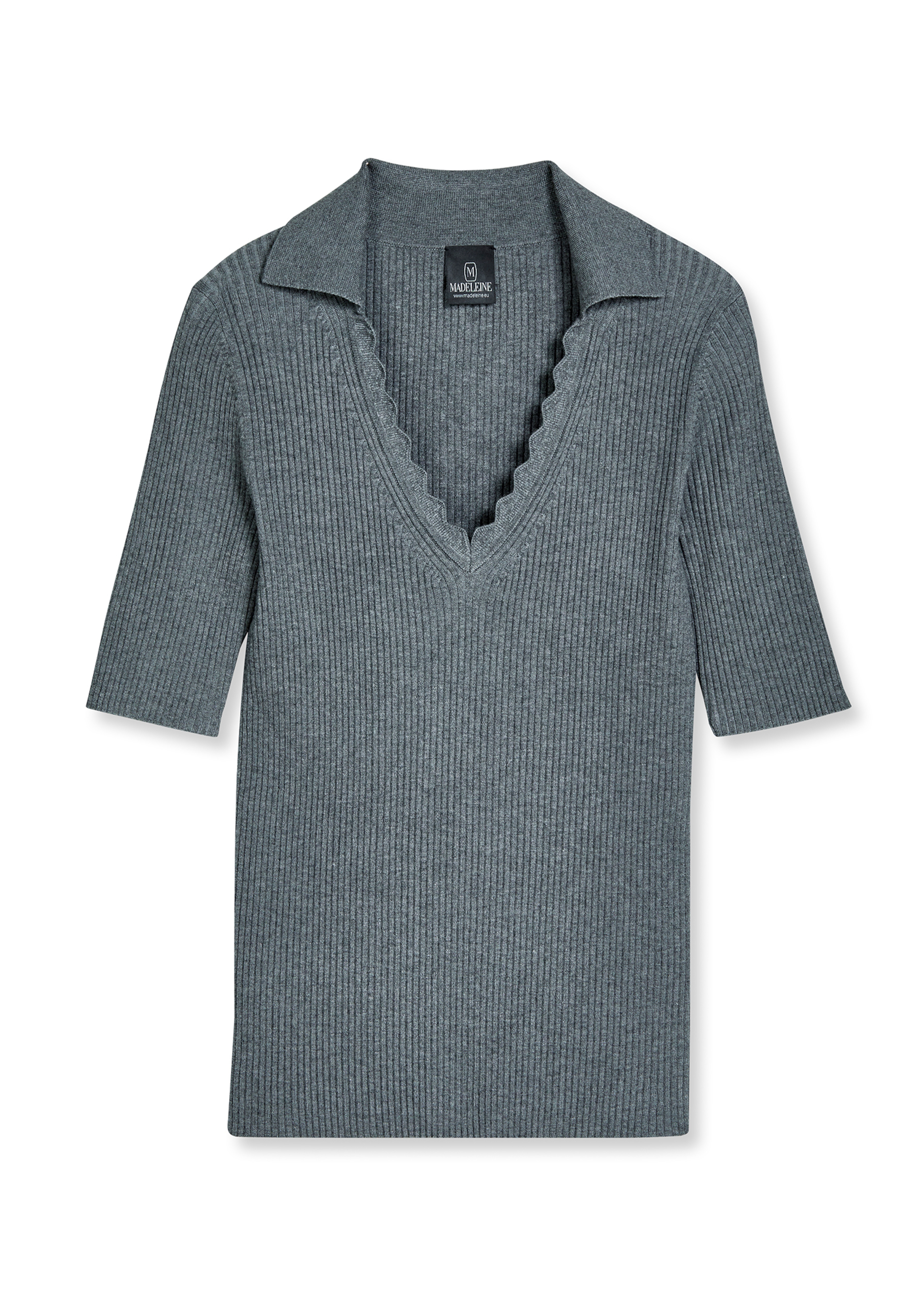 Ein Pullover, der sportive Lässigkeit mit femininem Charme verbindet. Der Pullover mit Wellenkante am V-Ausschnitt setzt das Dekolleté faszinierend in Szene. Der elastische Rippen-Formstrick im hochwertigen Viskose-Mix trägt sich angenehm weich auf der Haut. Der taillierte Polostyle mit kurzen Ärmeln zeichnet eine fantastisch schlanke Linie und feminine Silhouette.