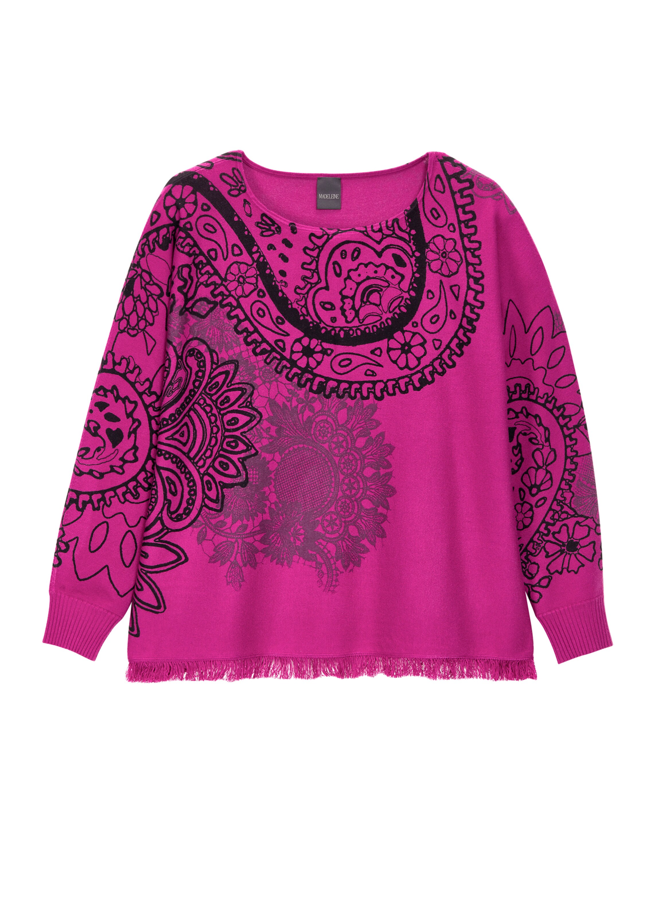 Ein Fashion-Star durch seinen platzierten Print auf feinem Strick. Der Pullover mit Muster setzt in lässiger Oversized-Boxyform den Trend. Ausgestattet ist er mit langen Ärmeln, gerippten Armabschlüssen und U-Boot-Ausschnitt. Feine Fransen setzen den Saum in Szene. Der Strick mit hohem Viskose-Anteil trägt sich angenehm weich.