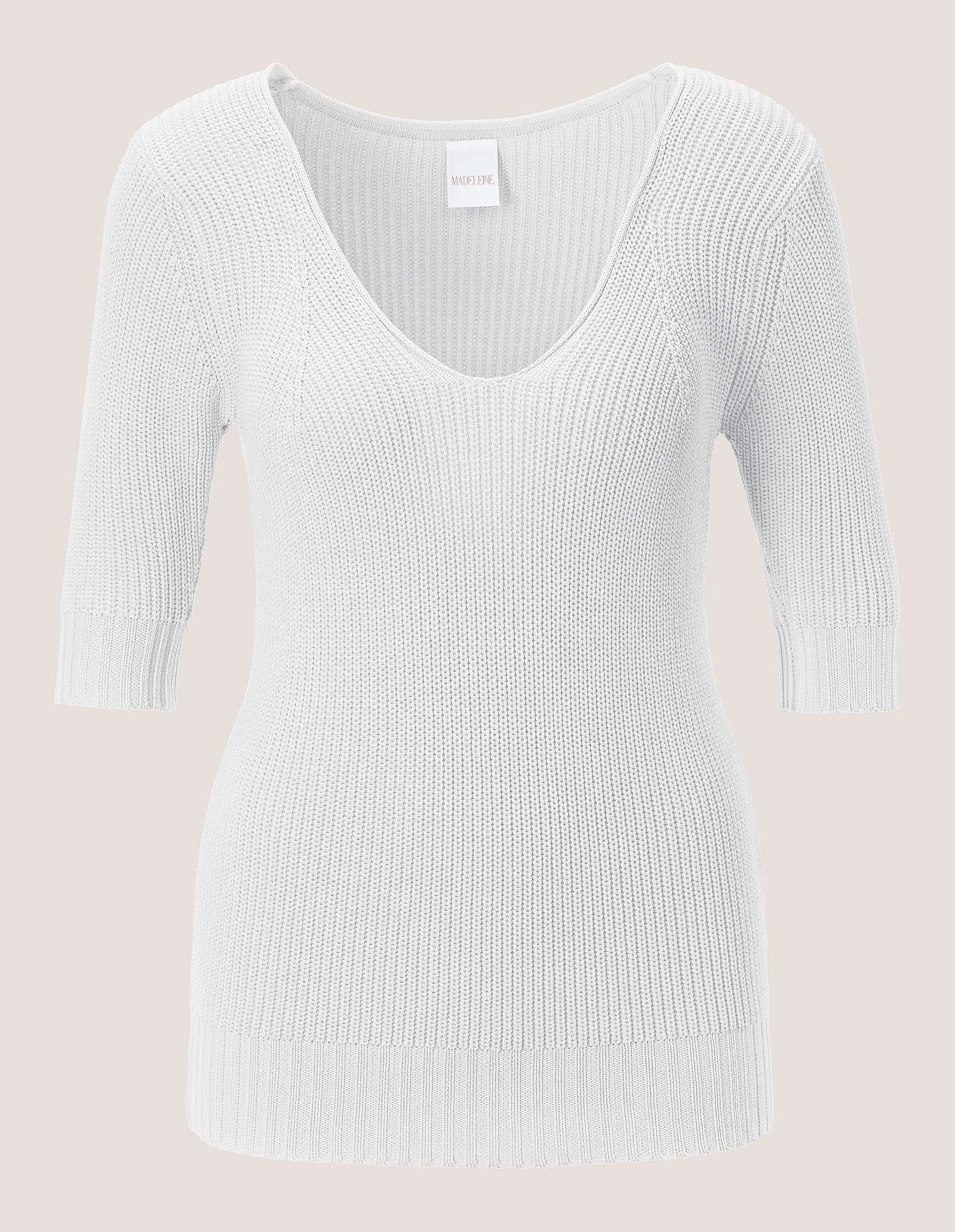 Sein markantes Maschenbild unterstreicht seine feminine Silhouette. Der Strickpullover mit kurzen Ärmeln erhält durch feine Minderungen den Fashionakzent. Das Garn im Viskose-Mix trägt sich angenehm sommerlich. Die lockere Form ist mit weitem, modern gestaltetem V-Ausschnitt und Halbarm gestaltet. Breite Bündchen setzen ihn sportiv in Szene. Kombinieren Sie ihn zu strahlendem Weiß für einen frischen, entspannten Sommerlook.
