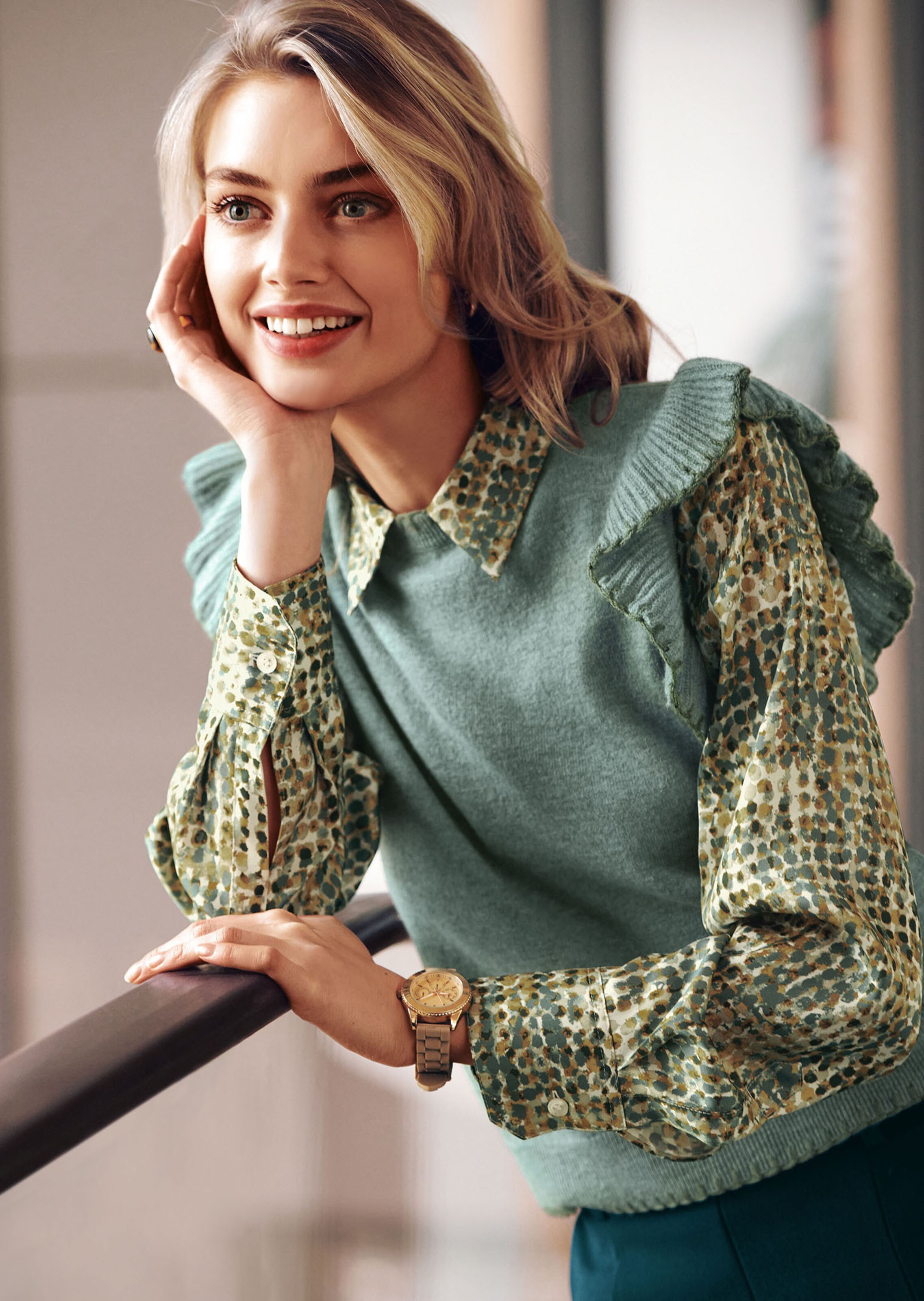 Rüschen und Volants erleben gerade ein großes Revival. Jetzt verschönern sie auch Pullunder wie diesen soften Styling-Könner mit dekorativen Volants. Der Pullunder ist hochwertig in Form gestrickt, hat einen kleinen Stehkragen aus Rippenstrick sowie einen formstabilen Rippstrickbund. Dekorative Zierstichnähte am Kragen, an den Volants und am Bund unterstreichen den modischen Style.