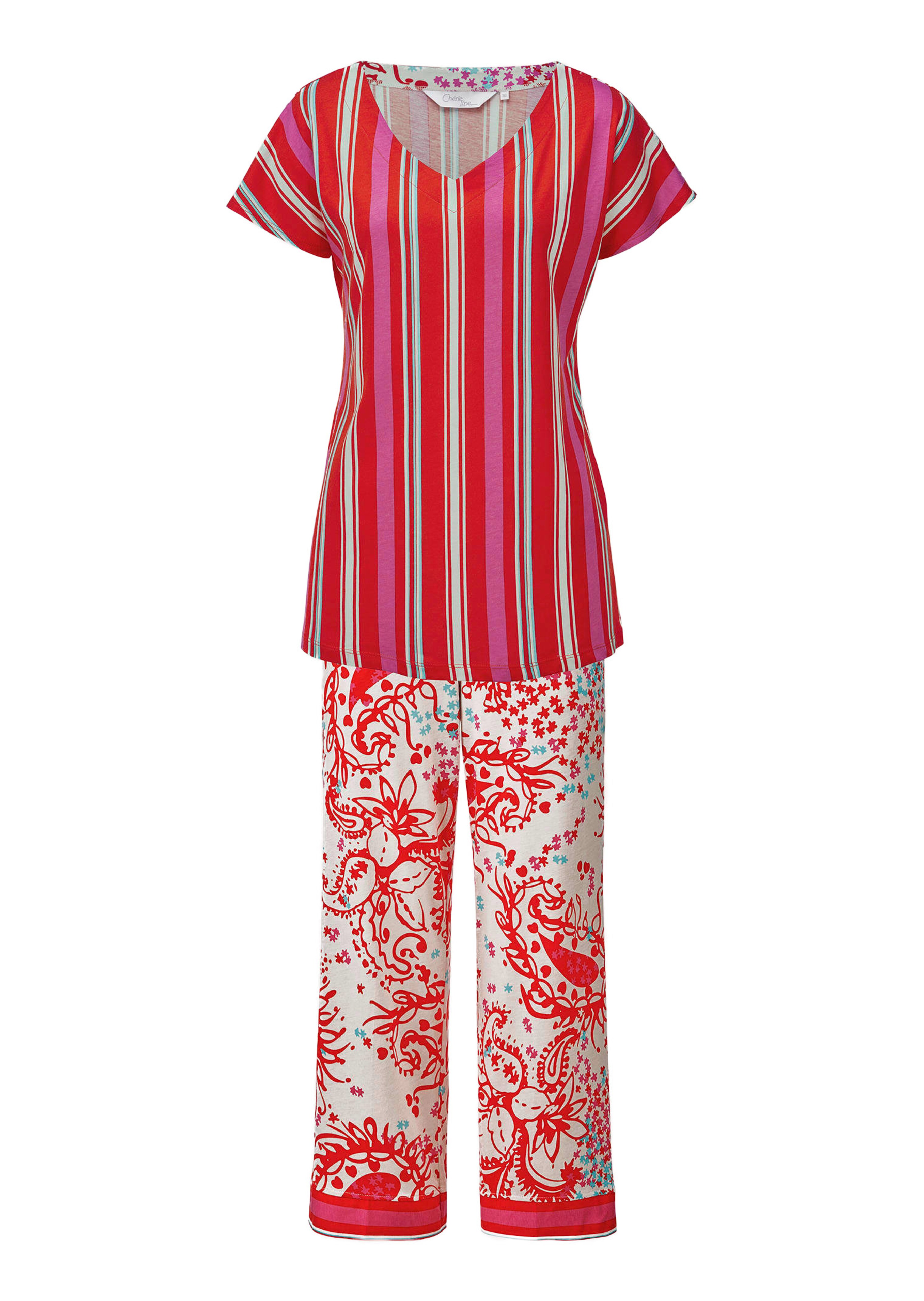 Pyjama von CHÉRIE LINE – Entspannung pur dank softem Baumwoll-Modal-Jersey. Das Shirt überzeugt mit V-Ausschnitt, modischer Passform und leicht überschnittenen Schultern, während das feminine Streifenmuster optisch streckt. Die locker geschnittene Hose mit bequemem Rundumschlupfbund und Bindeband rundet das Ensemble ab. Mit fantasievollem Druck in Paisley-Anmutung und Streifenbordüre am Saum.