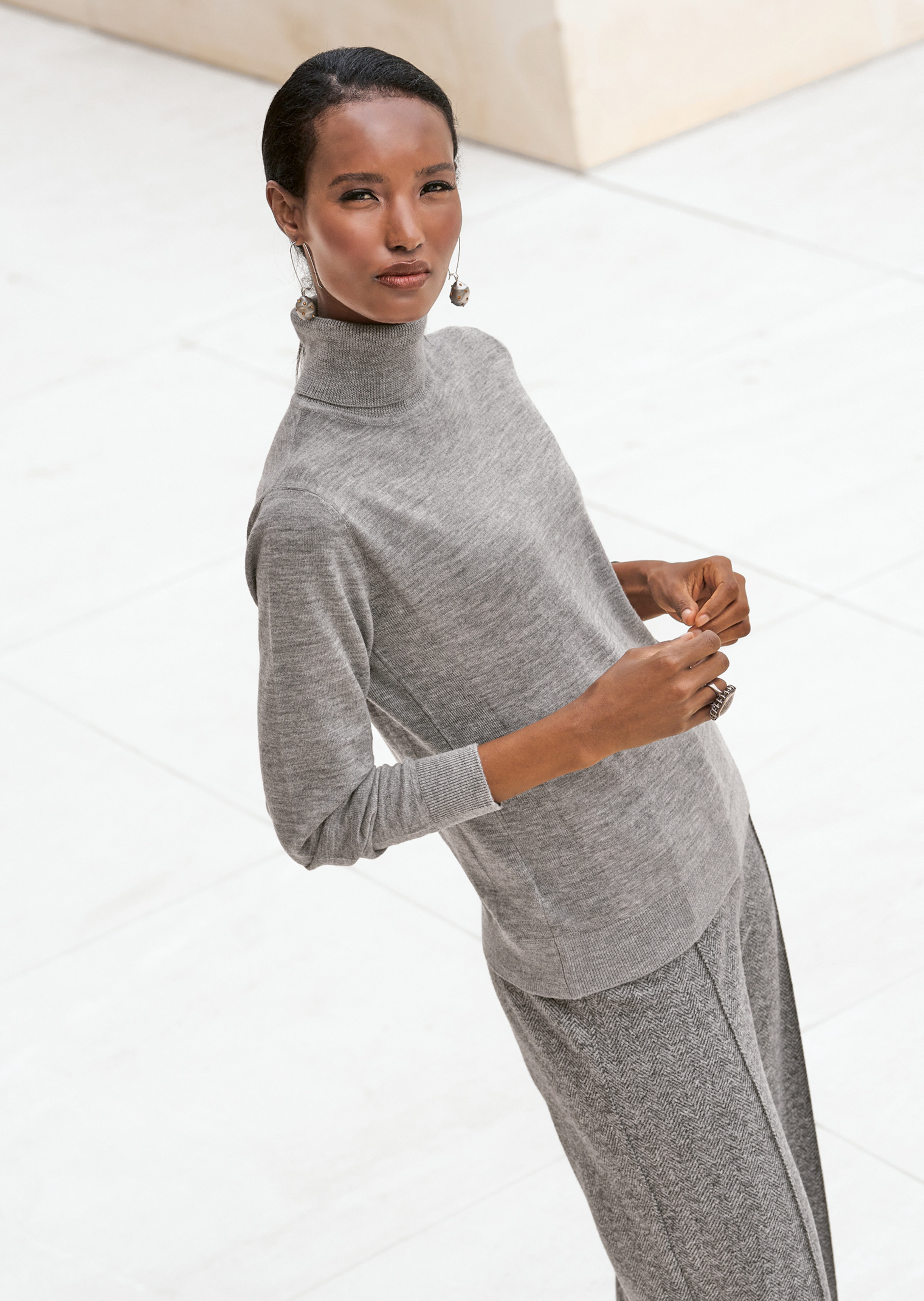Feinste, glattgestrickte Wolle in wertvoller Qualität macht aus diesem Pullover einen Strickpartner der gehobenen Art und begeistert mit stilvoller Modernität. Der schmeichelnde Rollkragen des Feinstrick-Pullovers schmiegt sich sanft an den Hals und verleiht dem Style eine gepflegte, souveräne Note! Ein Look, der von seitlichen Rippenpartien modisch aufgelockert wird und dadurch an Leichtigkeit gewinnt.