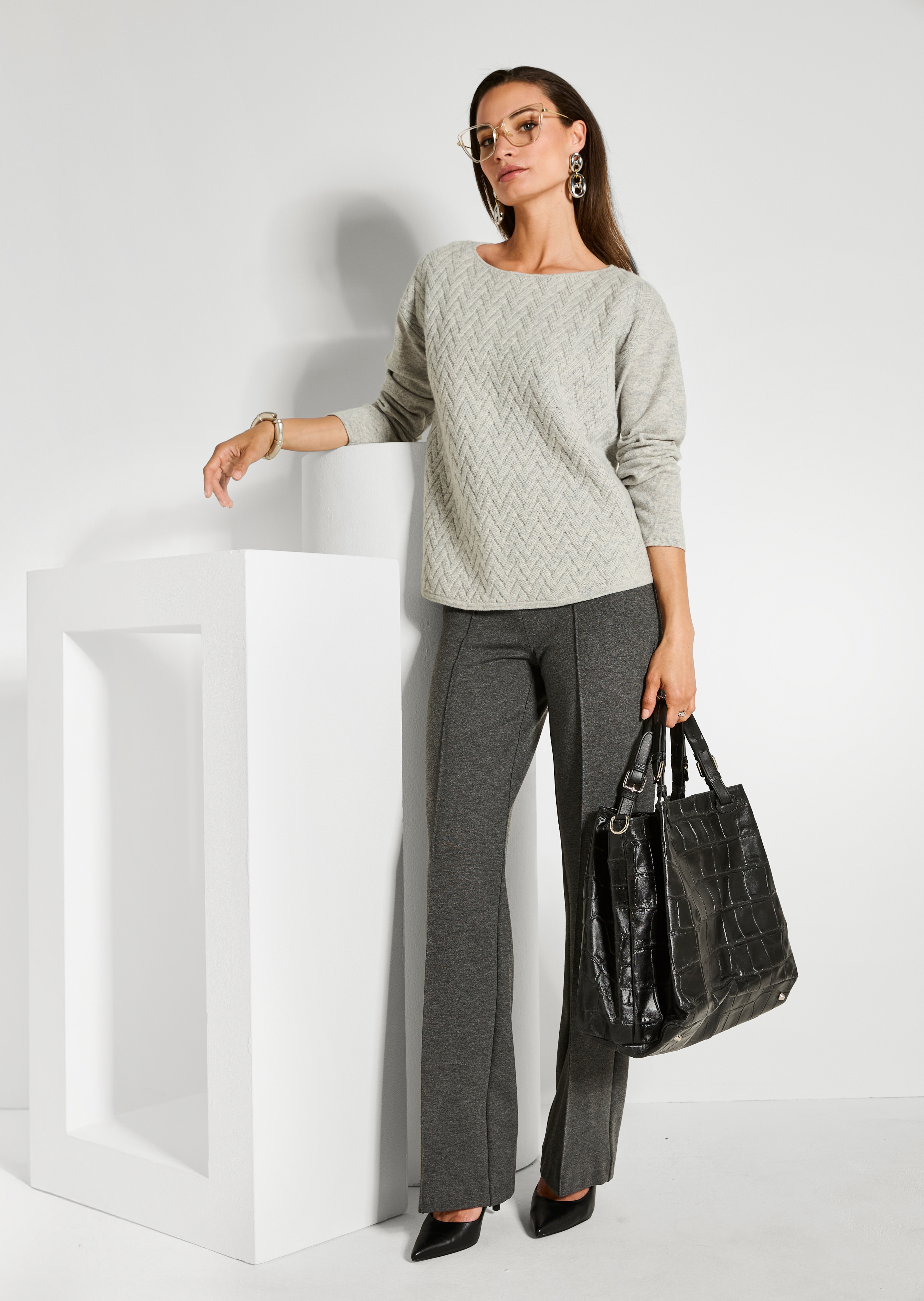 Ein stilvoller Begleiter, der luxuriƶsen Tragekomfort mit feinsinniger Gestaltung vereint. Die Kombination aus Schurwolle und Kaschmir ist wunderbar flauschig im Griff, wƤhrend der Schnitt sanft die feminine Silhouette umspielt. Die Vorderseite begeistert mit einem kunstvoll eingestrickten Jacquard-Muster, das dem Modell edle Struktur verleiht. Rückseite und Ćrmel sind in glattem Maschenbild gehalten und bilden einen sanften Kontrast zur strukturierten Front. Ein Zusammenspiel aus Ruhe und Eleganz. Der groĆzügige Rundhals-Ausschnitt wirkt modern und offen, ohne an Finesse zu verlieren. Abschlüsse in formstabilem Rippstrick rahmen Hals, Ćrmel und Saum hochwertig ein und garantieren langlebige Passform. Ein edler Strickpartner, der sich mühelos in jede anspruchsvolle Garderobe einfügt. Vielseitig kombinierbar, geschmackvoll im Ausdruck und ideal für viele Gelegenheiten.
