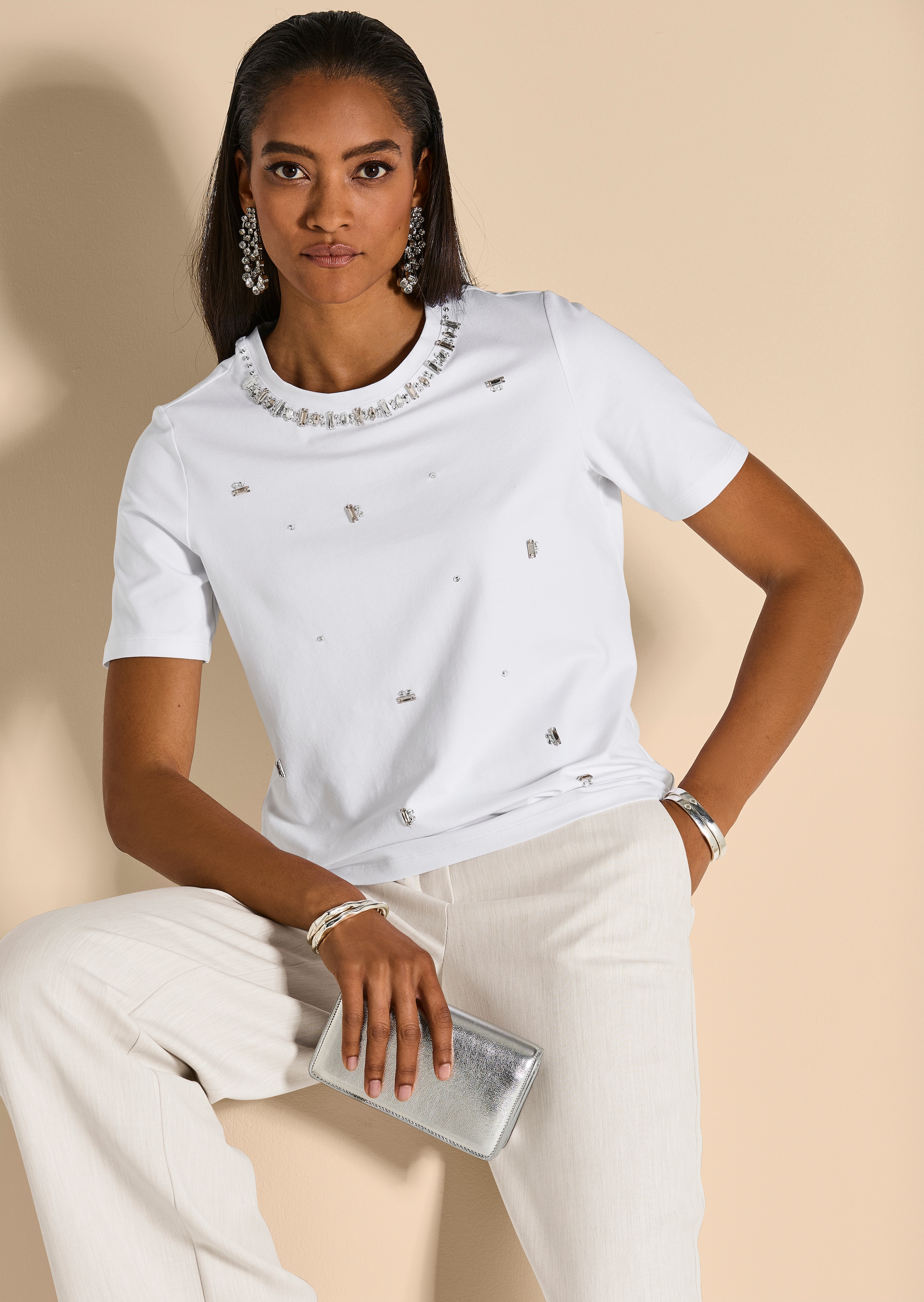 Ein reizvoll femininer Look und für Darunter wirklich zu schade. Der bequeme Baumwoll-Stretch des Shirts ist angenehm auf der Haut und macht jede Bewegung problemlos mit. Modisches Highlight sind zweifellos die funkelnden Glanzlichter, die an Vorderseite und Rundhals-Ausschnitt in Form von glitzernden Strass-Applikationen Glamour in den Look bringen. Die klassische Rundhals-Form ist feminin tailliert und schmiegt sich sanft an die weibliche Figur. Kurze Ärmel runden den Look unaufgeregt ab.