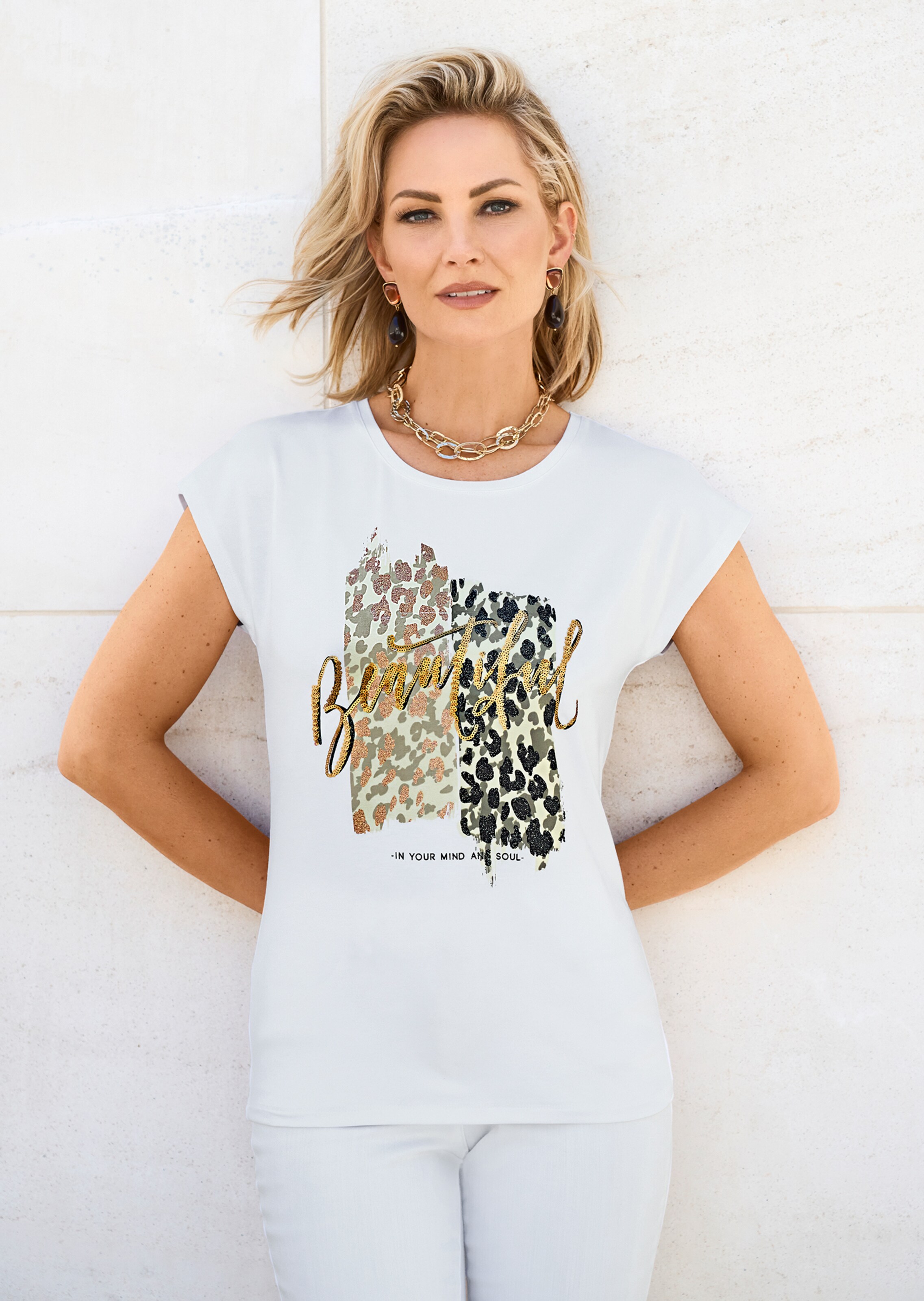Ein Basic für unbeschwerte Sommer-Looks, angenehm auf der Haut und mit trendstarkem Akzent. Der glanzvolle, vorderseitige Druck des Shirts ist wertvoll platziert und wird zusätzlich von glitzernden Pailletten akzentuiert. Ein Style, der Schwung in den Look bringt und mit fein paspeliertem Rundhals-Ausschnitt und überschnittener Schulterpartie gearbeitet ist.
