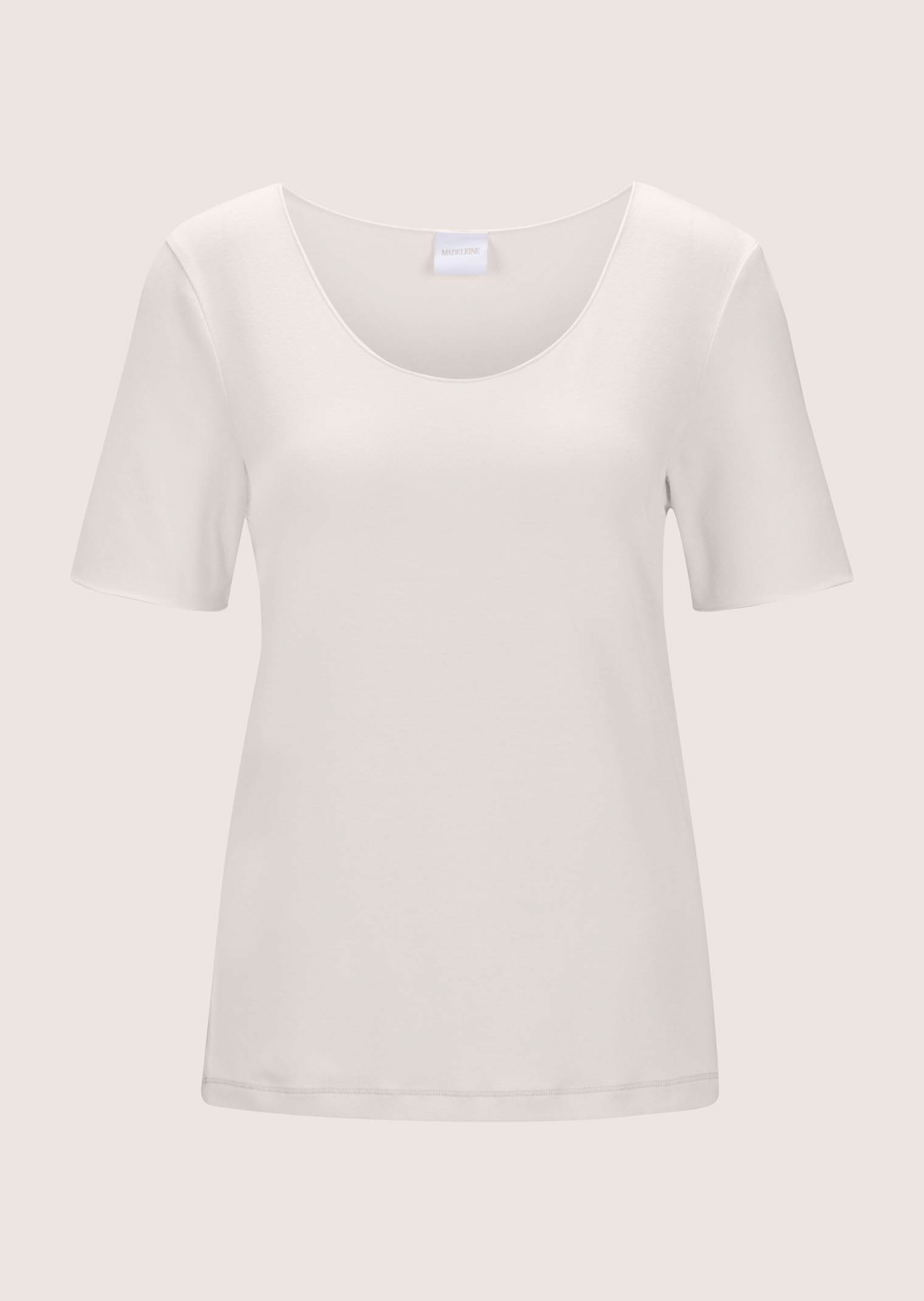 Ein Shirt, das vielseitig kombiniert werden kann und in keiner Sommer-Garderobe fehlen sollte. Hautschmeichelnder Viskose-Stretch ist weich fließend und angenehm kühl auf der Haut. Die softe Qualität macht jede Bewegung mit und zeigt sich hier in feminin taillierter Kurzform. Rundhals-Ausschnitt und halblange Ärmel werden von einer edlen Overlock-Kante akzentuiert und beweisen Liebe zum Detail.