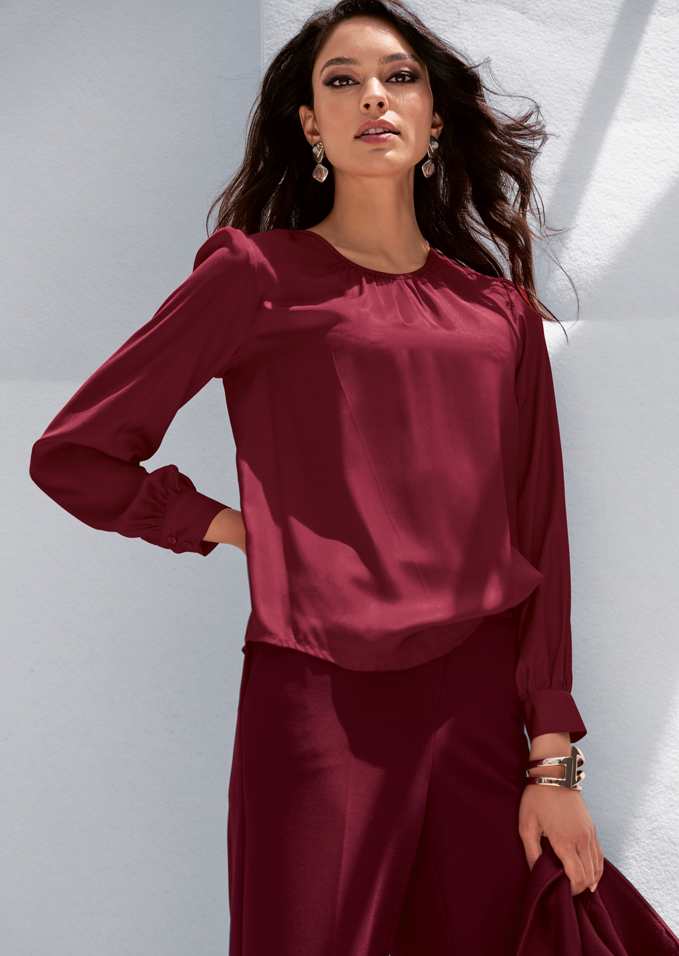 Zart schimmernder Satin bringt immer eine Prise Luxus in den Look und besticht mit femininer Eleganz. Der kragenlose Rundhals-Ausschnitt ist zauberhaft in Falten gelegt. Mit rückseitigem Knopfverschluss verleiht einen Hauch Raffinesse und sorgt für bequemes Einsteigen. Lange Ärmel mit schmaler Knopfmanschette machen den lässig-eleganten Look perfekt. Ein zeitloses Essential für jeden Anlass!