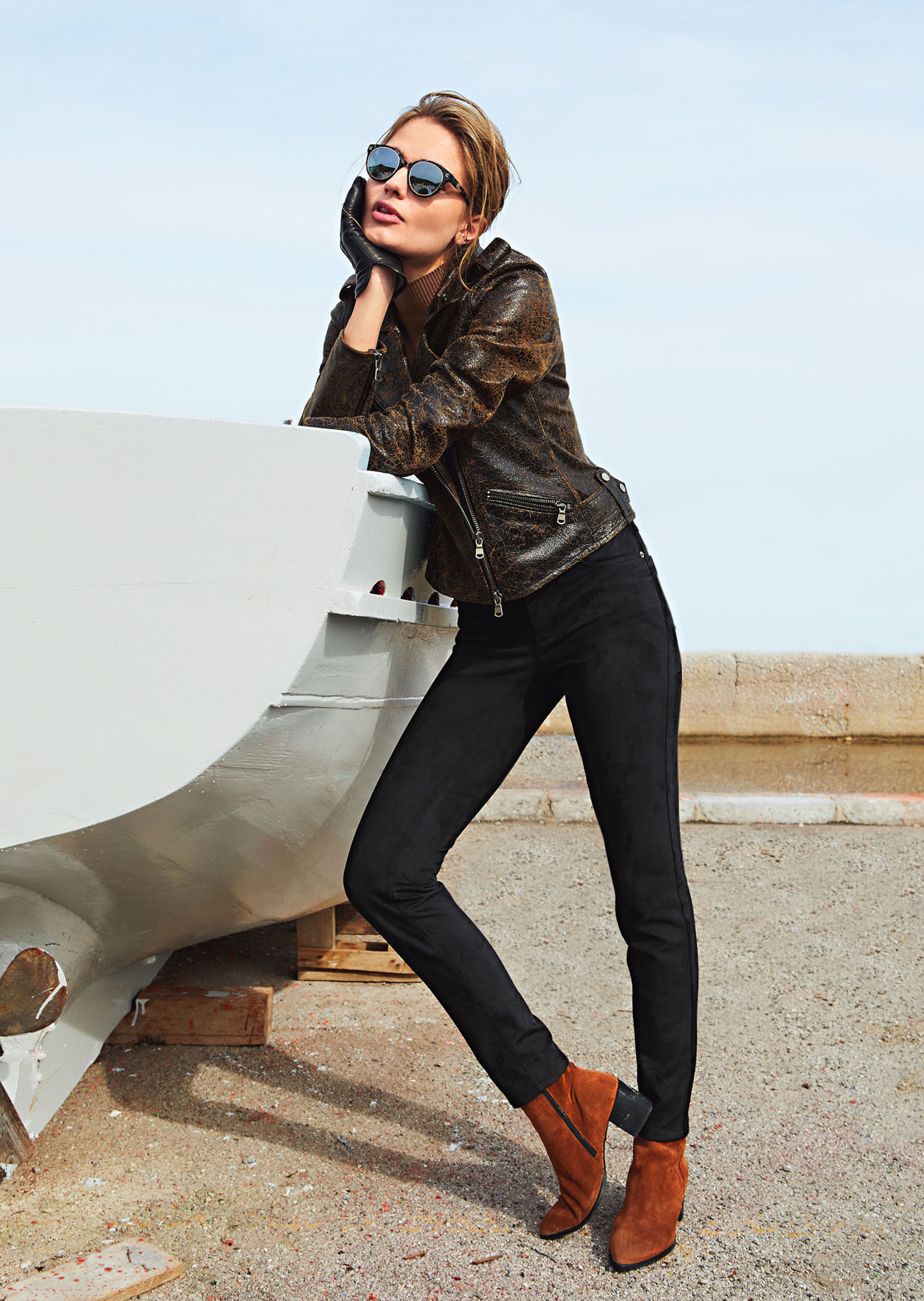 Ein modisch bequemer Allround-Style im Skinny-Fit für viele Gelegenheiten! Der komfortable Stretch-Velours der schlanken Jeggings ist dank Komfortbund bequem zum Schlüpfen und macht jede Bewegung mit. Der 4-Pocket-Look mit einer rückwärtigen Formpasse sorgt für besten Sitz. Gürtelschlaufen und Nieten machen den Style komplett.