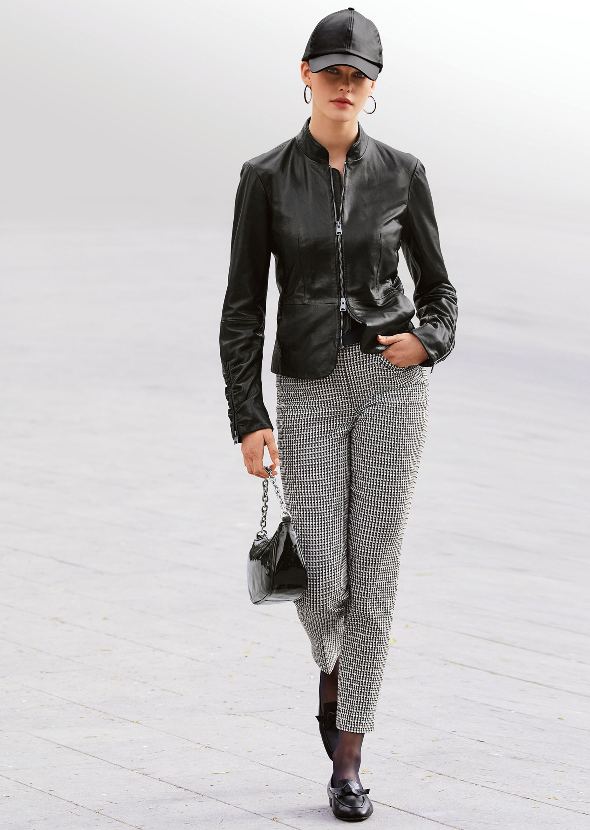 Puristischer Luxus-Chic: Die schlichte Lederjacke aus Lammnappa ist eine vielseitige Allrounderin für unzählige Kombinationen. Die schlanke, taillierte Form ist mit Stehkragen, 2-Wege-Zipper, Kettenaufhänger und Kräuselungen entlang der Ärmelzipper gestaltet. Die Nahttaschen haben verdeckte Drucker.