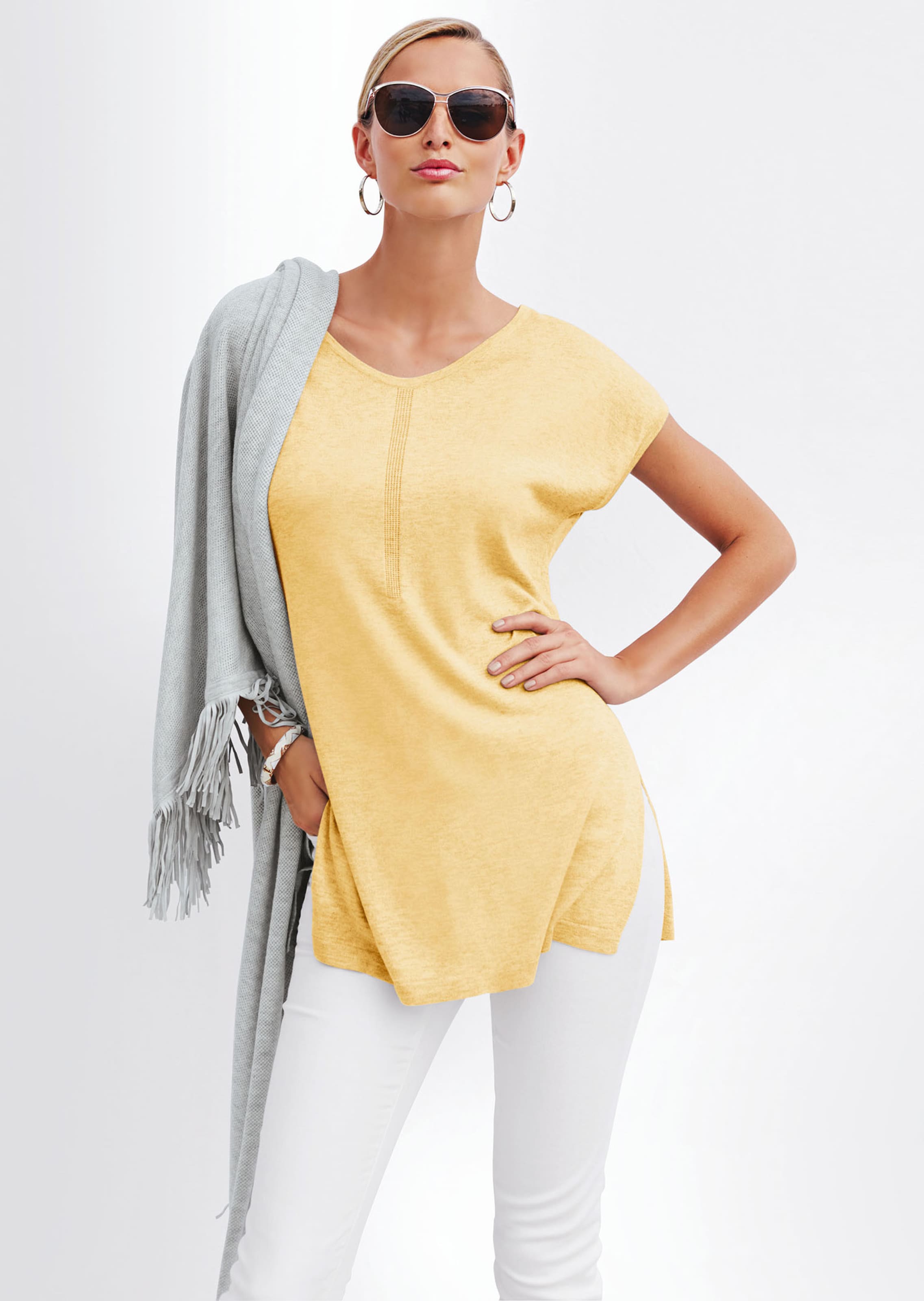Der Basic-Pullover inszeniert sich diese Saison neu: Subtile Musterspiele aus feinem Ajourstrick setzen im Vorderteil und Rücken edle Akzente. Der trageangenehme, leicht fließende Garnmix mit Kaschmir bringt Softness und Leichtigkeit in den Look. Die legere, modisch verlängerte Form steht für die neue Lässigkeit und ist mit V-Ausschnitt, überschnittenem Ärmel, Seitenschlitzen und flachen Tubularabschlüssen stilsicher gestaltet. Integrierte Bra-Tapes und die aufwendige Fully fashion-Verarbeitung sorgen für eine optimale Passform. Mal lässig leger im Casual-Look, mal unkompliziert elegant im Business-Stil – dieser Longpullover lässt keine Kombiwünsche offen!