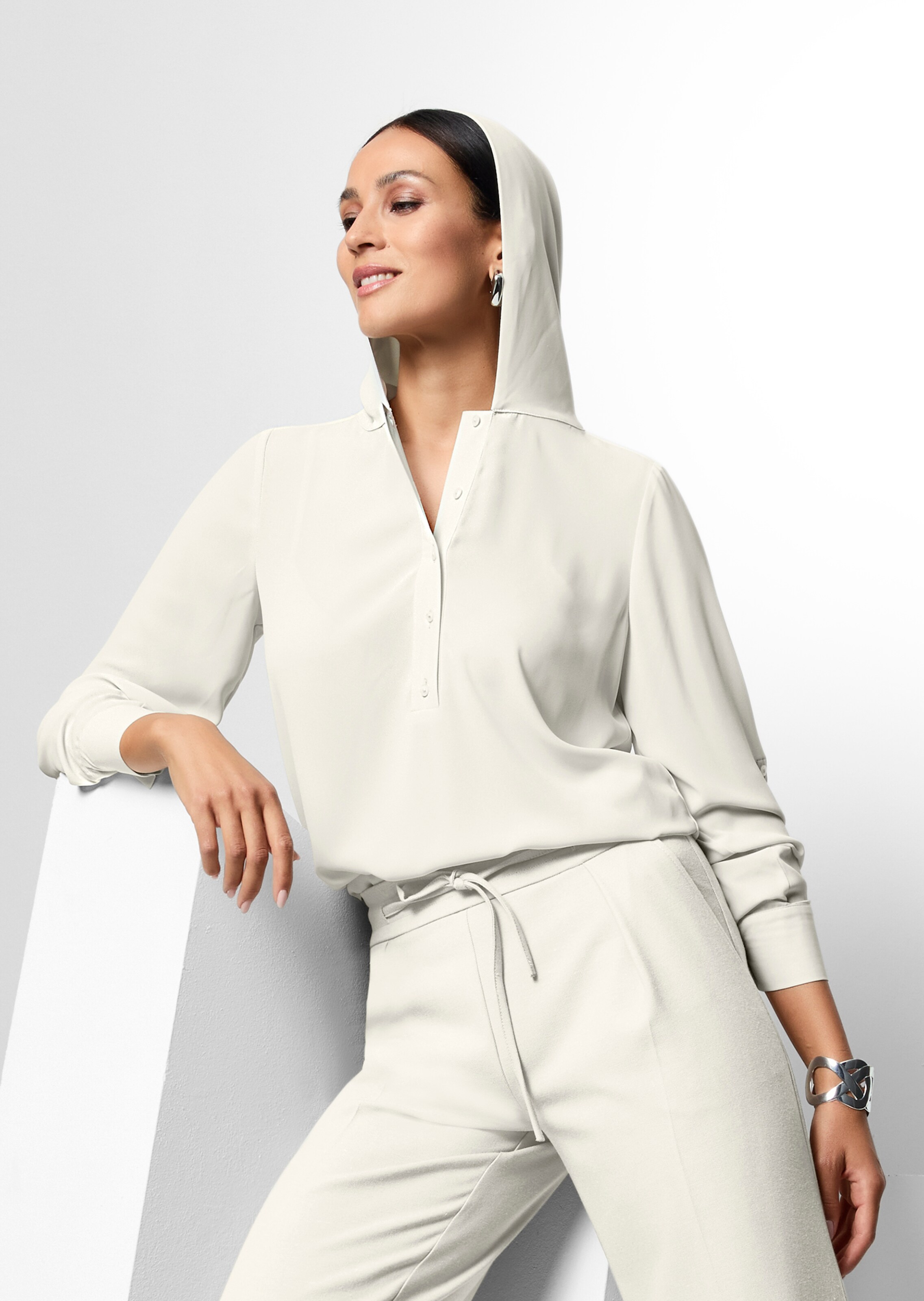 Die Lust an Blusen ist ungebrochen und bringt immer wieder neue Design-Ikonen hervor. Die stylische Schlupfform sorgt dank langer Knopfleiste für bequemes Einsteigen und ist mit einer Kapuze ausgestattet. Ein Look, der Modeherzen höher schlagen lässt. Die langen Ärmel mit breiten Knopfmanschetten sind praktisch zum Krempeln und können per innenseitigem Riegel fixiert werden. Das weich fließende Material ist zart transparent und sanft im Trage-Gefühl. Gerundete Saumkanten und der modisch verlängerte Rücken sind ideal zum darüber tragen.