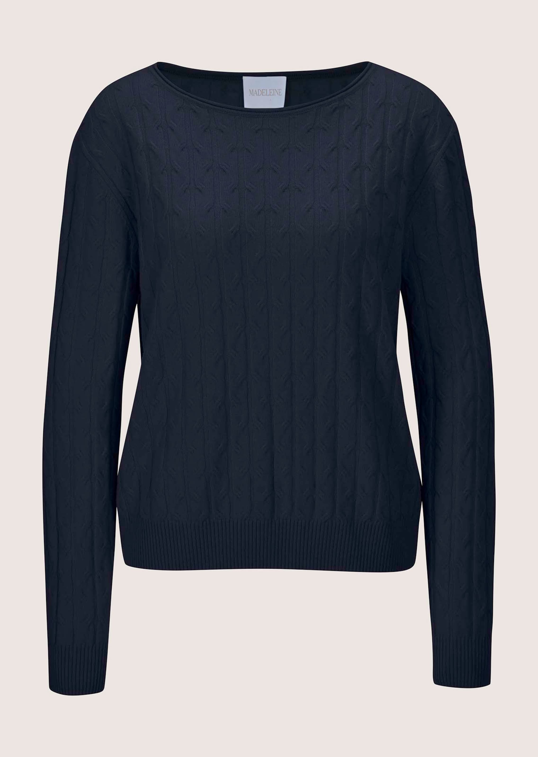 Ein eleganter Klassiker, neu interpretiert. Hochwertig verarbeitete Schurwolle ist eindrucksvoll weich im Griff und begeistert mit hautschmeichelndem Komfort. Perfekt für anspruchsvolles Understatement. Das rundum gearbeitete Zopfmuster verleiht dem Modell eine dezente Struktur, die sowohl solo als auch in Kombination mit edlen Layering-Partnern überzeugt. Der sanft anliegende Rundhals-Ausschnitt wird von einer filigranen Rollkante eingefasst. Ein subtiler Akzent, der das Design geschmackvoll abrundet. Lange Ärmel und Saum schließen mit formstabilen Rippenbündchen ab. Sie bewahren die Passform und verleihen dem Gesamtbild einen harmonischen Rahmen. Ein Pullover von zeitloser Eleganz, der durch seine Vielseitigkeit und Raffinesse begeistert.