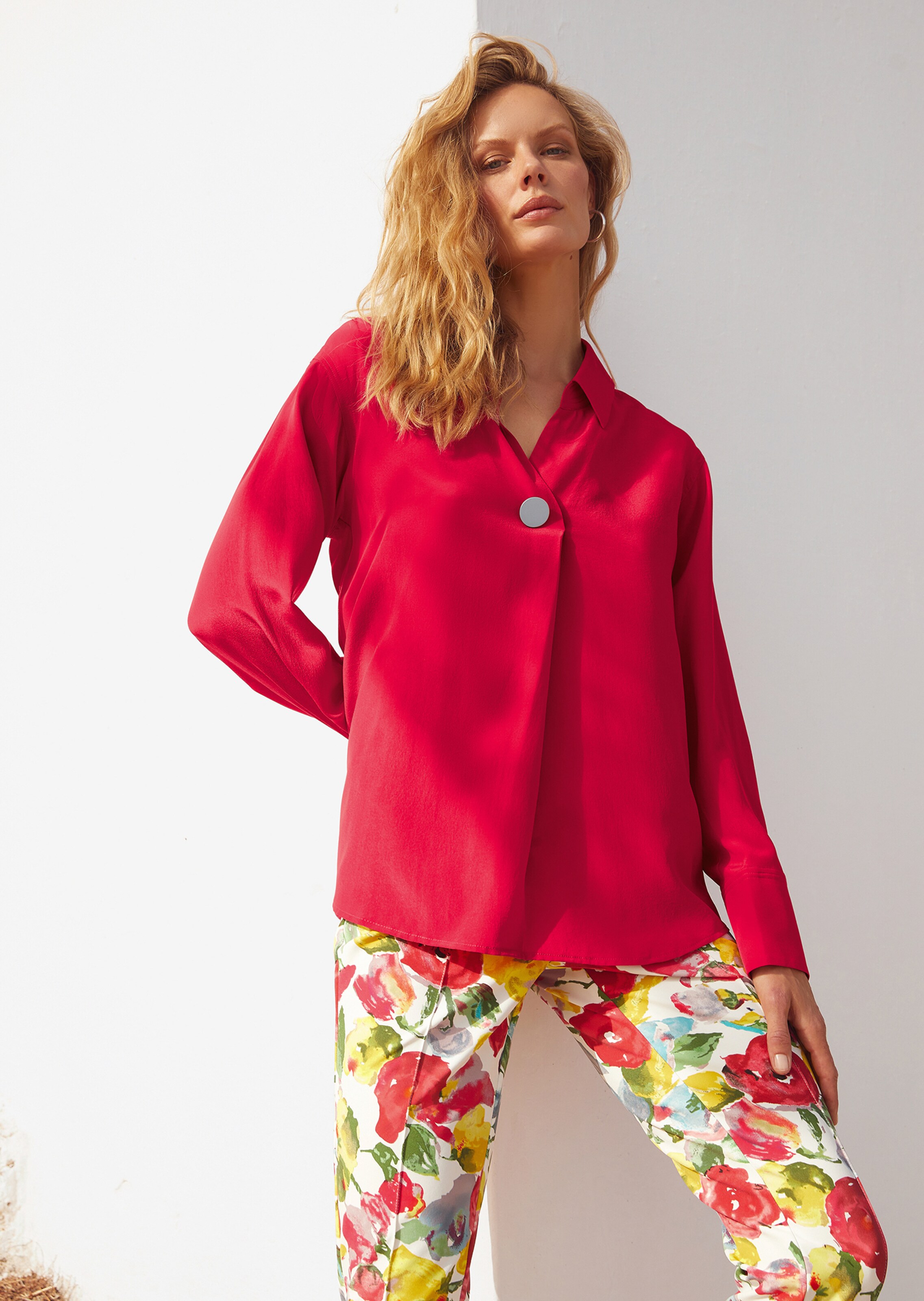 Ihre modisch elegante Ausstrahlung und das einzigartige Trage-Gefühl machen die Bluse zu einem Styling-Partner der Extraklasse. Zart schimmerndes Seidengarn fasziniert mit unbeschreiblich schmeichelndem Griff und ist angenehm kühl auf der Haut. Die legere Form des Lieblingsstücks umspielt großzügig die Figur und lässt angenehm Luft an den Körper. Besonders raffiniert: der Dekolleté-Bereich ist leicht umgeschlagen und wird von einem markanten, zart schimmernden Metallknopf fixiert. Ein Detail, das die Bluse zu einem echten Schmuckstück macht und bei jeder Gelegenheit für begeisterte Blicke sorgt. Ein klassischer Hemdkragen und die überschnittene Schulterpartie sind gesetzt. Die Saumlinie ist leicht gerundet und geht fließend in den modisch verlängerten Rücken über. Die Knopfmanschetten der langen Ärmel sind liebevoll in Falten gelegt und mit farbgleichen Logo-Knöpfen ausgestattet. Sie runden den Look stilgerecht ab.