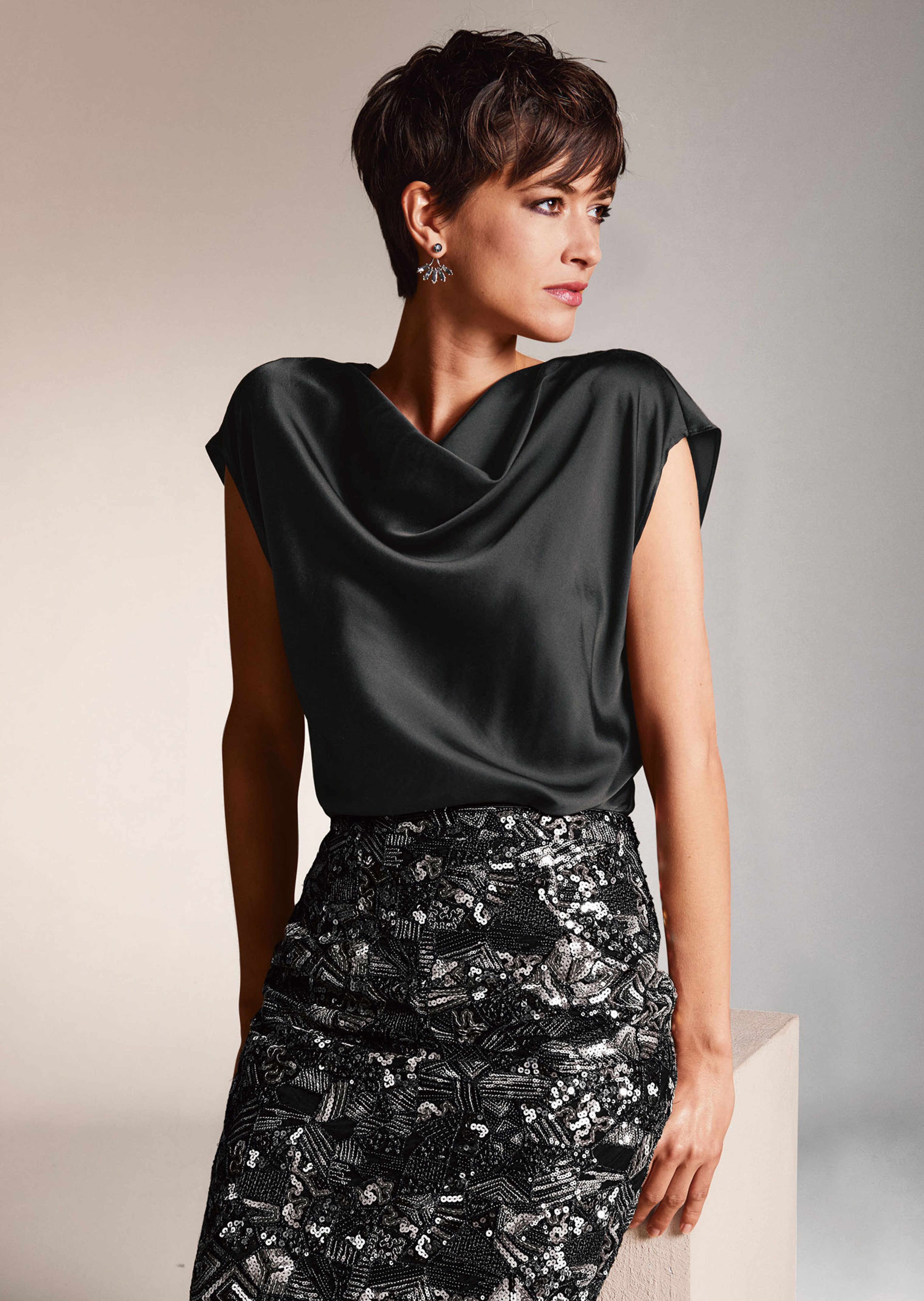 Ein Shirt, das als Abendshirt und auch am Tag mit seiner Kostbarkeit überzeugt! Das Seidenshirt aus geschmeidig fließendem Seidenstretch schimmert wertvoll im Licht. Der feminine Style ist für einen modernen Look mit überschnittenem Arm und Wasserfallkragen gestaltet. Ein praktisches Detail sind die BH-Spangen: Sie können daran Ihre BH-Träger befestigen, so sitzt das Shirt immer optimal. Kombinieren Sie es zu tonigen Partnern oder im Kontrast – für einen modernen Look mit Klasse.