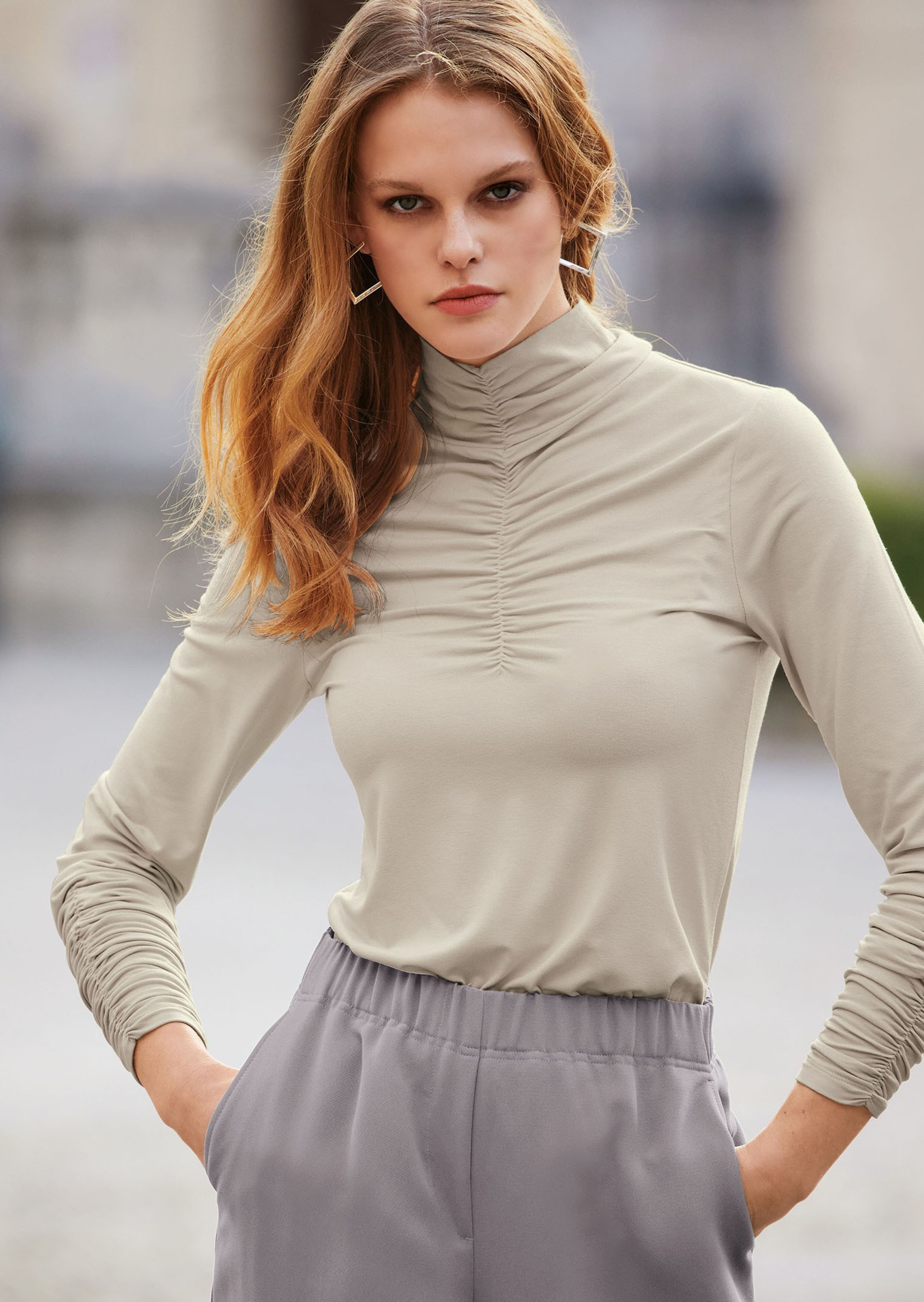 Ein fantastischer Effekt: Das Shirt mit Raffungen zeigt die tollen, femininen Details am Stehkragen, den langen Ärmeln und im Vorderteil. Der elastische Viskosestretch trägt sich angenehm auf der Haut und wirkt mit seiner Oberfläche sehr edel. Zeitgemäß mit nachhaltigen Viskosefasern der Marke LENZING™ ECOVERO™. Ob lässig oder elegant kombiniert: das Edelshirt verleiht Ihrem Styling das Extra.