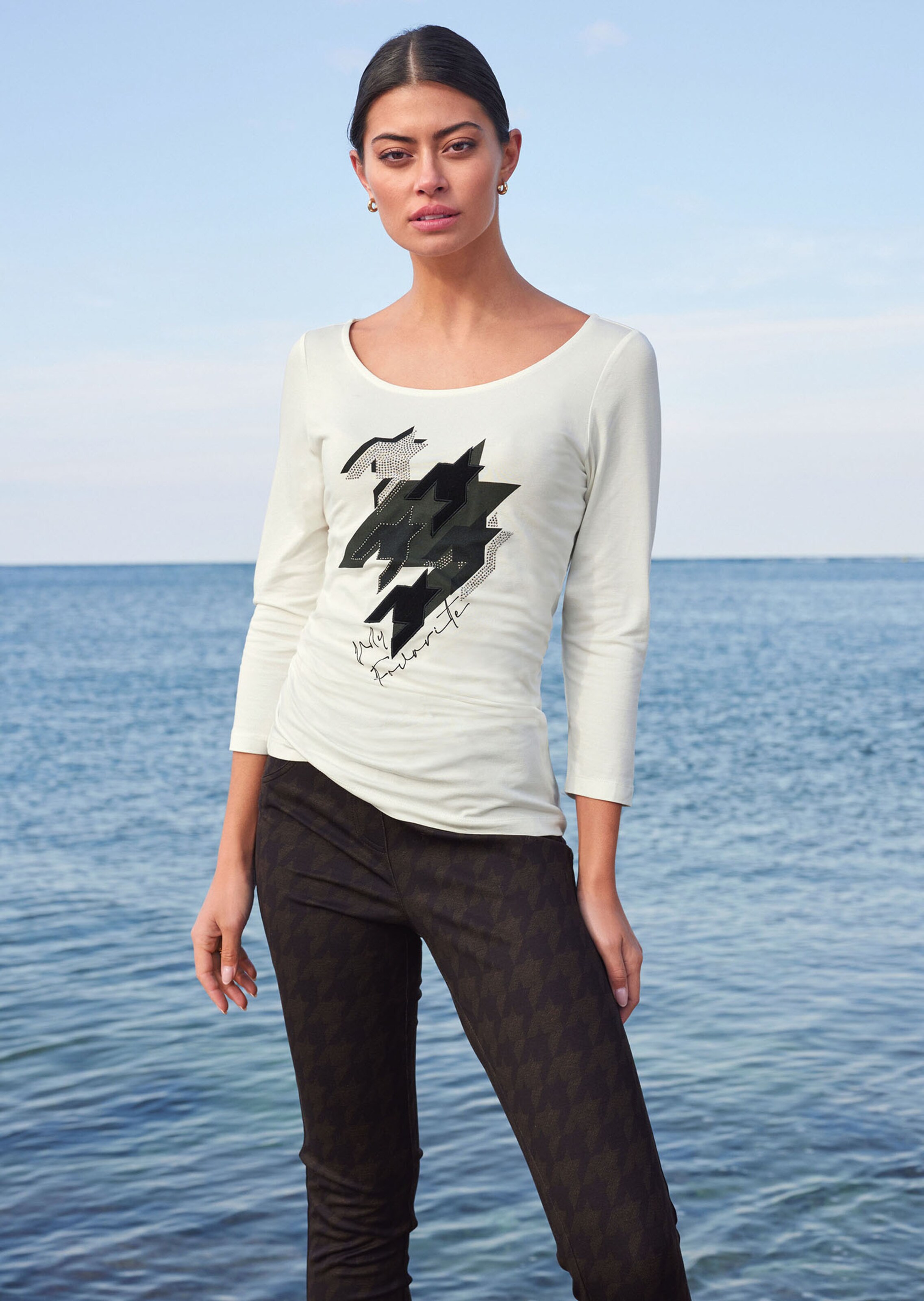 Ein Shirt, das mit vorderseitigem Grafik-Print Schwung und Frische in den Look bringt. Der hautschmeichelnde Garnmix ist feminin tailliert und macht dank Stretch-Anteil jede Bewegung mit. Bequem im Trage-Gefühl und ideal für den Reisekoffer ist das Rundhals-Shirt mit modischen 3/4-Ärmeln gearbeitet. Das Druckmuster ist von Modell zu Modell variabel und macht jedes Stück zum Unikat.