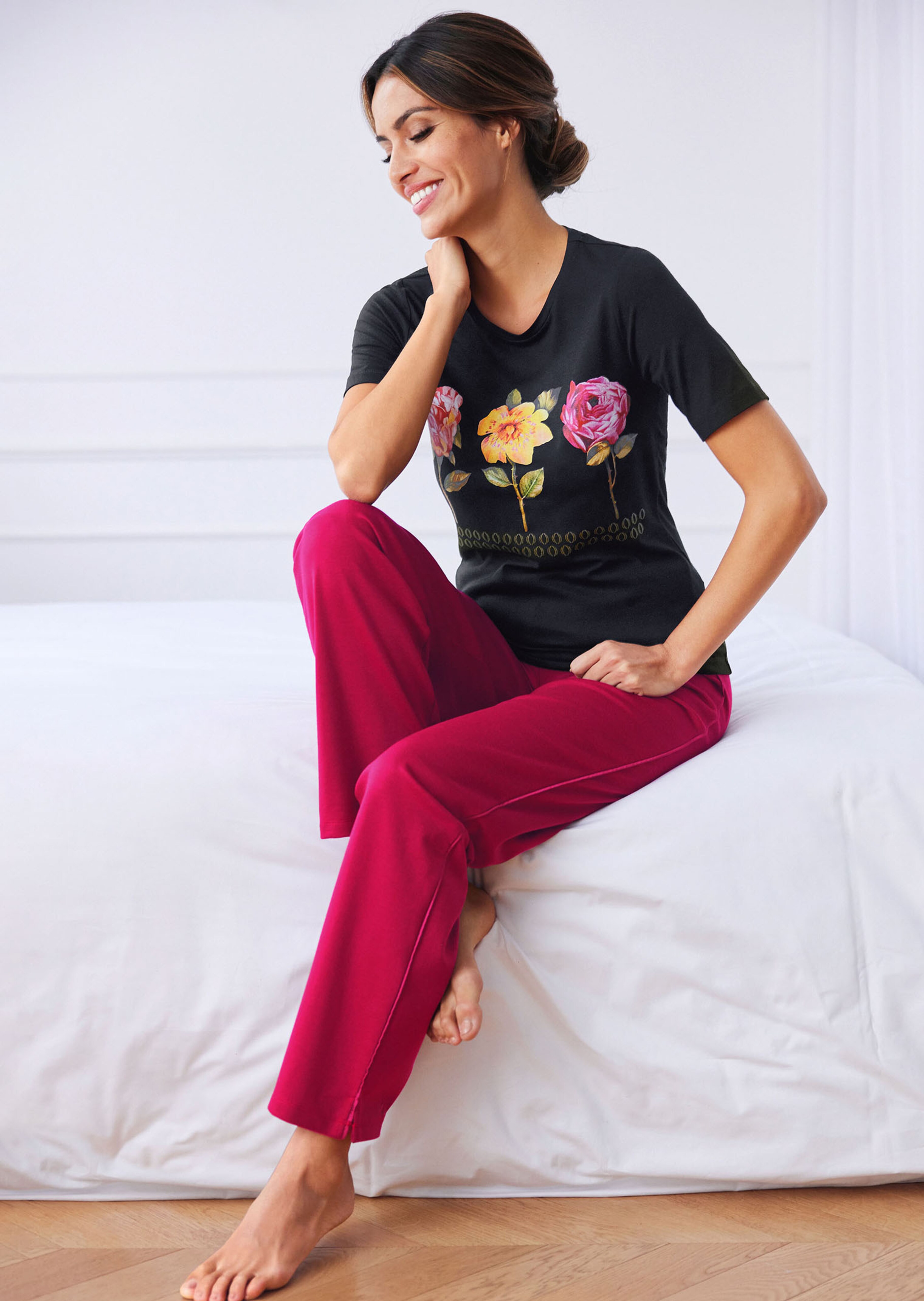 Shirts können auch Trendsetter sein! Das beweist vor allem dieses Modell, das mit platziertem Blumenmotiv im Vorderteil alle Blicke auf sich zieht. Herrlich trageangenehm und klassisch gestaltet mit Rundhalsausschnitt und kurzem Ärmel ist es das ganze Jahr über ein attraktives Kombi-Shirt – casual zu Loungepants, chic zum Blazer.