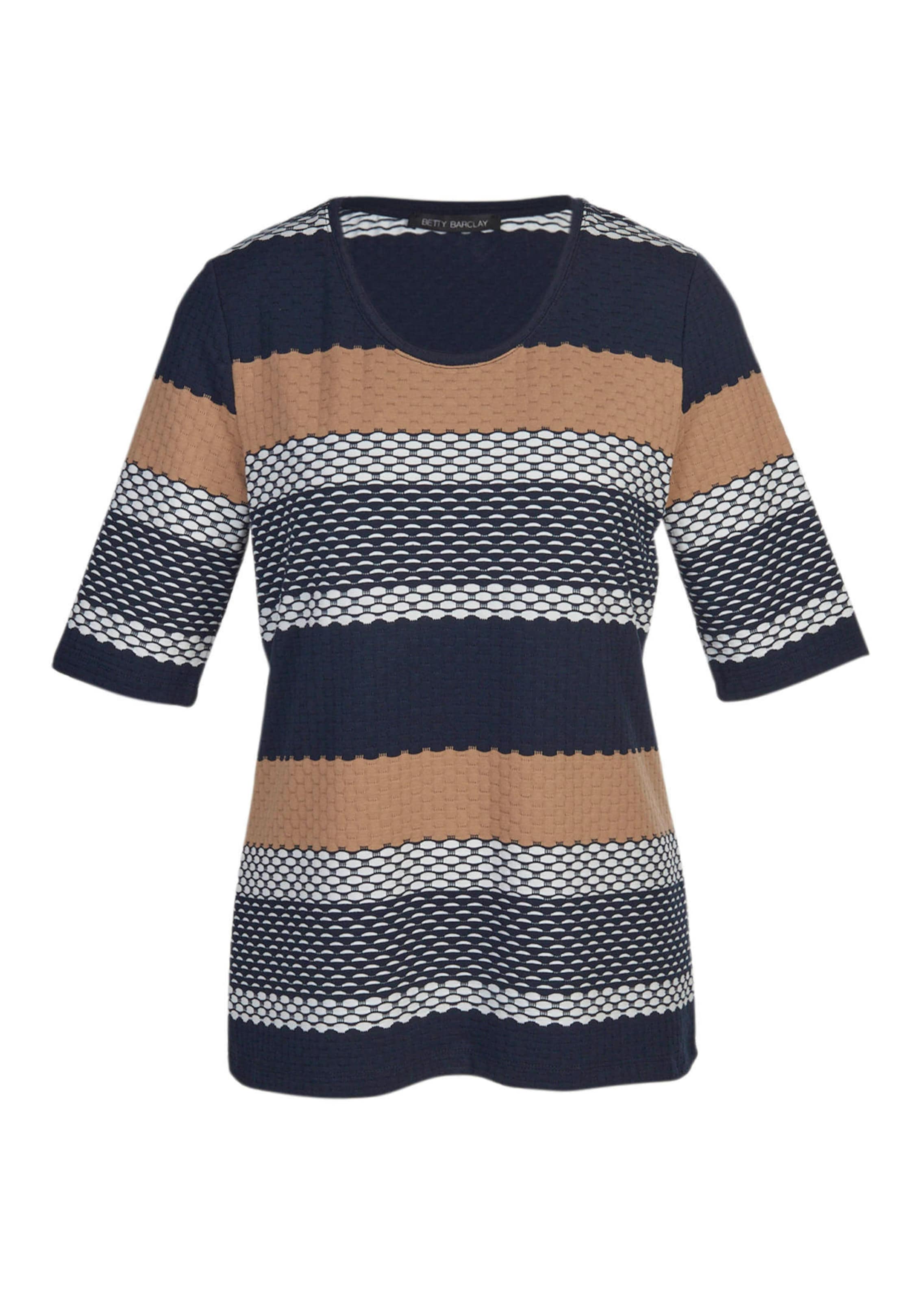 Shirt mit Jacquard-Muster von BETTY BARCLAY. Das beliebte Basic-Teil darf in keinem Kleiderschrank fehlen. Es trägt sich herrlich weich dank der stretchbequemen Viskose-Mixqualität. In figurumspielender Passform mit Rundhalsausschnitt und Halbarm sitzt es jederzeit perfekt und lässt sich vielfältig kombinieren. Länge in Gr. 38 ca. 64 cm. Styling-Tipp: Dieses Kombiwunder ist allzeit bereit, Ihr neues Lieblingsteil zu werden! Zu Jeans, Wide-Leg-Pants, Röcken oder unter Blazern verleiht es jedem Look einen lässigen Style.