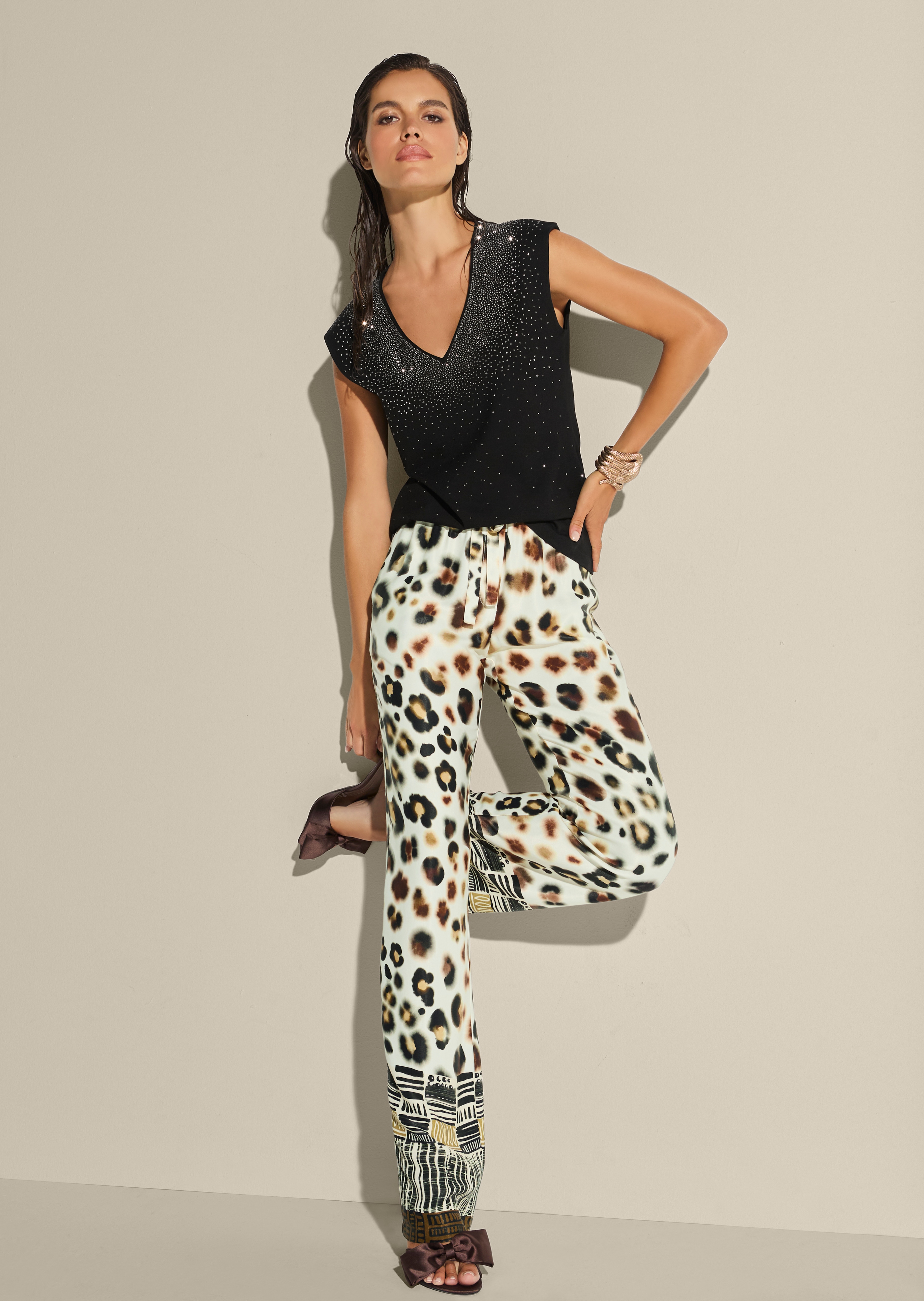 Wenn der Anlass nach einem besonderen Outfit verlangt, ist dieses Shirt die richtige Wahl. Die funkelnde Strass-Dekoration auf dem Vorderteil bringt viel Glanz in den Look, der V-Ausschnitt sorgt für ein schönes Dekolleté. Die ärmellose, taillierte Form betont die Figur und lässt sich vielseitig kombinieren – zum fließenden Satinrock, zur weiten Hose oder auch als Highlight zu Denim.