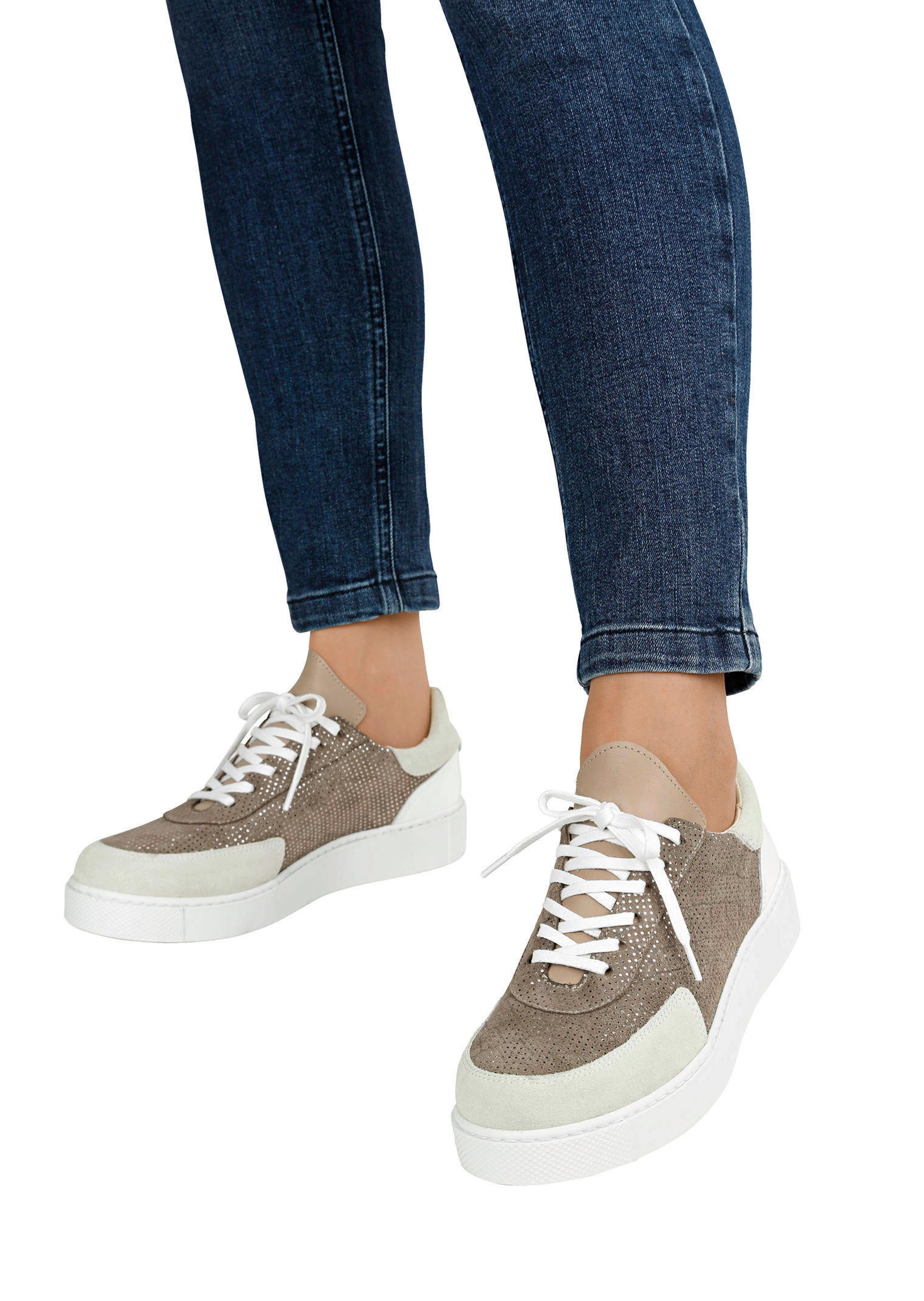 Dieser Sneaker im modernen Look von Alba Moda sind aus Rauleder gefertigt. Das Plateau hat eine Höhe von 3,5 cm. Guten Halt garantiert die dämpfende Sohle aus Synthetikmaterial. Die Decksohle ist aus Textilmaterial. Dieses Modell hat glatte Sohle. Für einen normalen Fuß geschnitten. Zum Öffnen und Schließen hat er eine Schnürung. Diese Schuhe entsprechen dem Größensystem: Europäisch (EU).