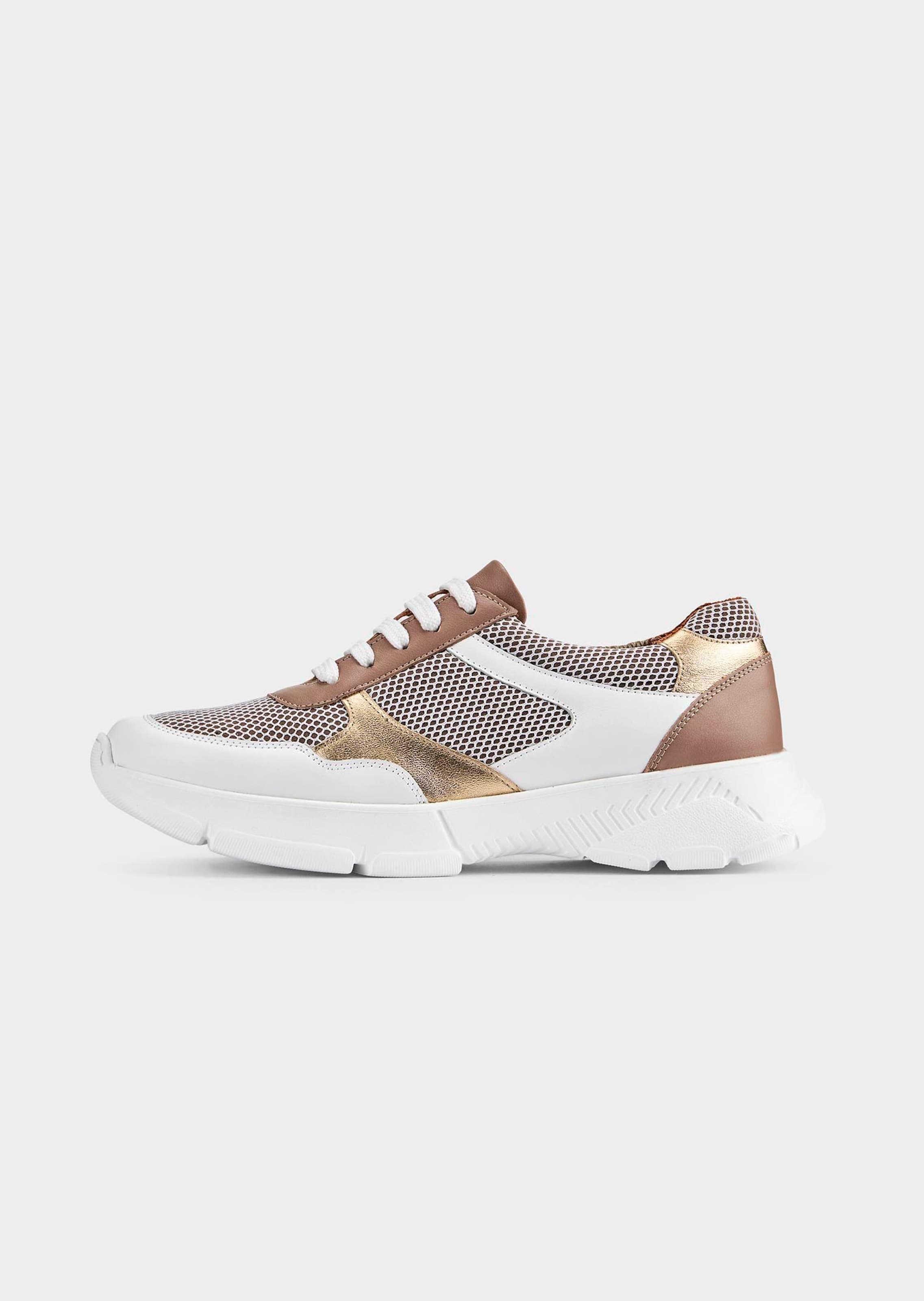 Sneaker aus Leder und Textil mit atmungsaktiven Netzeinsätzen. Schlüpfen Sie ganz bequem in das Modell dank praktischem Reißverschluss, für die individuelle Weitenregulierung ist die helle Schnürung zuständig. Farbharmonisches, feminines Modell mit glänzenden Details und lederbezogenem Wechselfußbett. Flexible EVA-Laufsohle. In H-Weite.