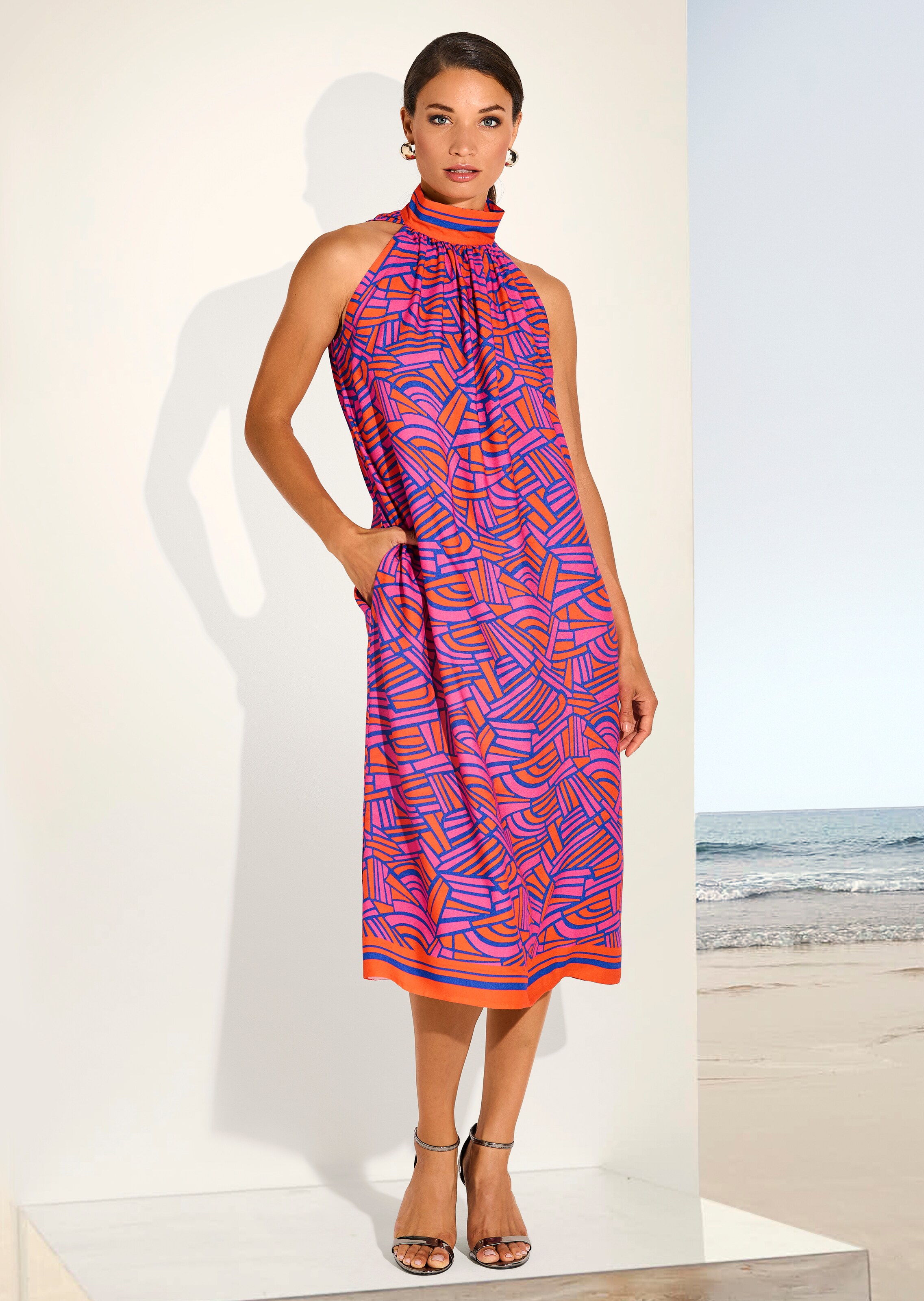 Dieses farbenfrohe Druckkleid mit grafischem Print ist ein Must-have für den Sommer. Die weiche Viskosequalität sorgt für hohen Tragekomfort, während der Stehkragen mit Kräuselungen und rückseitigen Knöpfen dem Kleid eine besondere Note verleiht. Streifen an Kragen und Saum runden das Design ab. Das ärmellose Kleid in Midi-Länge mit amerikanischer Schulter und leichter A-Linie schmeichelt der Figur und liegt mit seinem grafischen Muster voll im Trend. Die geschickt platzierten Nahttaschen bieten nicht nur Stauraum, sondern unterstreichen auch den lässigen Look. Perfekt für warme Tage, die sich mit dem Kleid wie ein Kurzurlaub anfühlen.