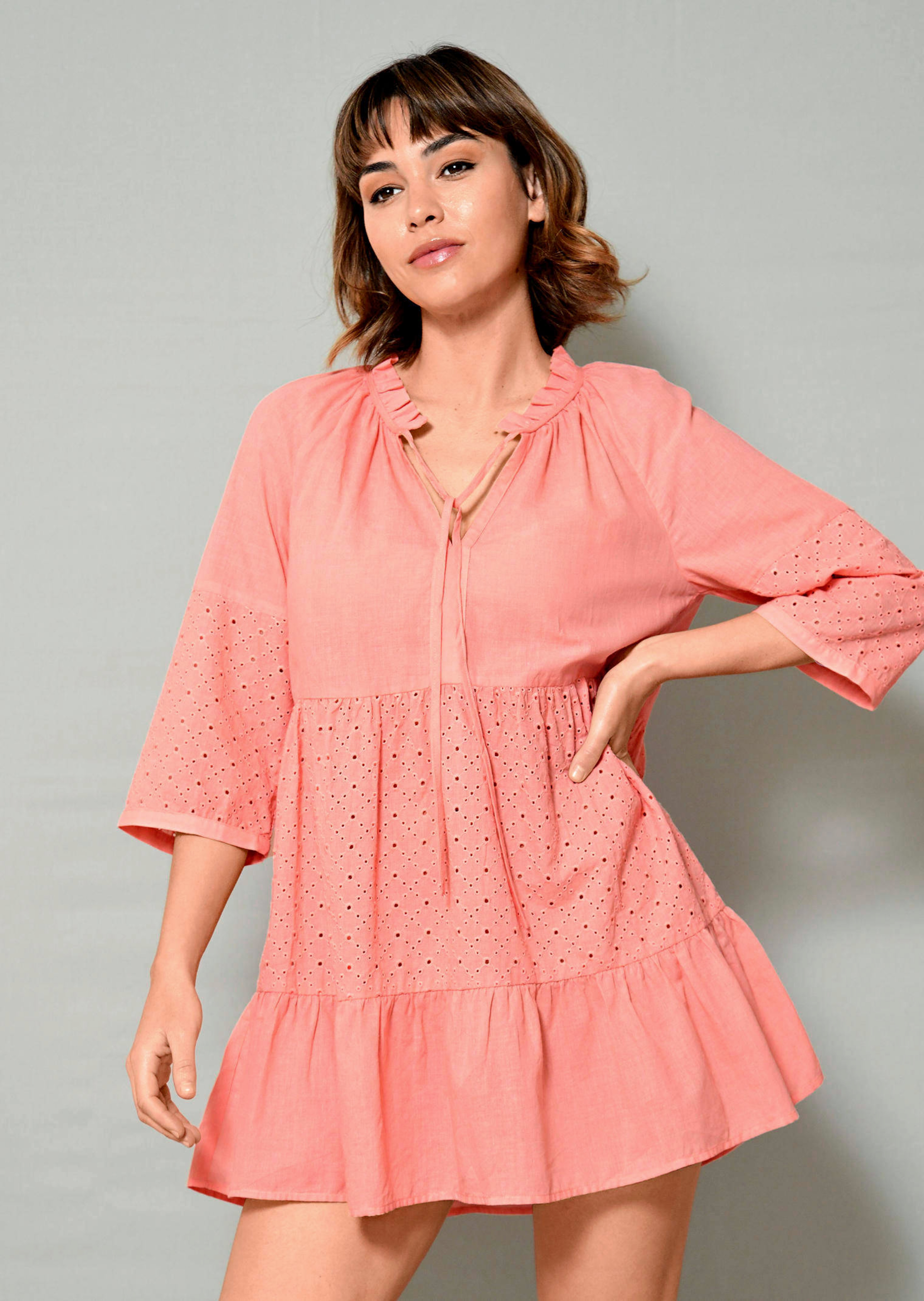 Aufwändige Lochstickerei und V-Ausschnitt mit Rüschen und Bindeband. In trageangenehmer, sommerleichter Baumwollqualität von ALBA MODA. 3/4-langer Ärmel mit geradem Abschluss. Leicht durchscheinend. Länge in Gr. 36 ca. 82 cm.